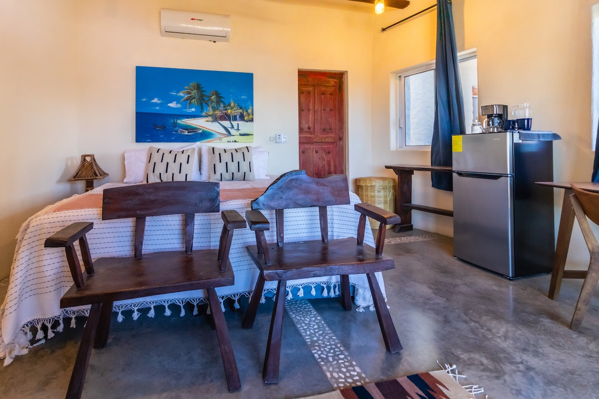 Very small, cozy unit with one Queen bed. It is surrounded by garden at the far back of our property with 6 more units in the front part that all together make up our "Sayulita Oasis". It has a private en-suite bathroom. Please note that it does not have a kitchen / fridge. Feel free to use the small, shared dipping pool in the front area. Also, please look at the last photo. It shows and describes the layout of the whole property and all it's casitas and common areas like pool or gardens.