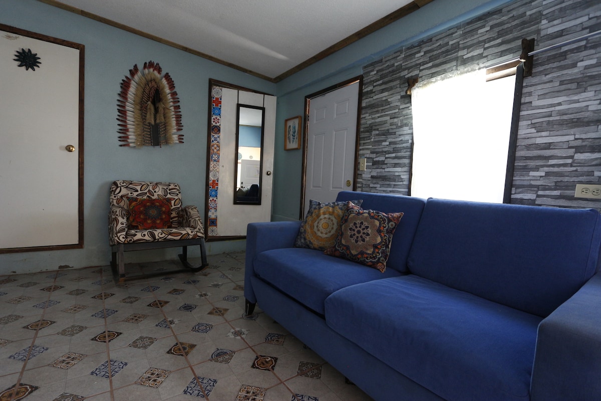 Tiny House Estrella , una casita para 4 personas, tiene dos camas queen baño , una una cocina pequeña, refrigerador , aire acondicionado .