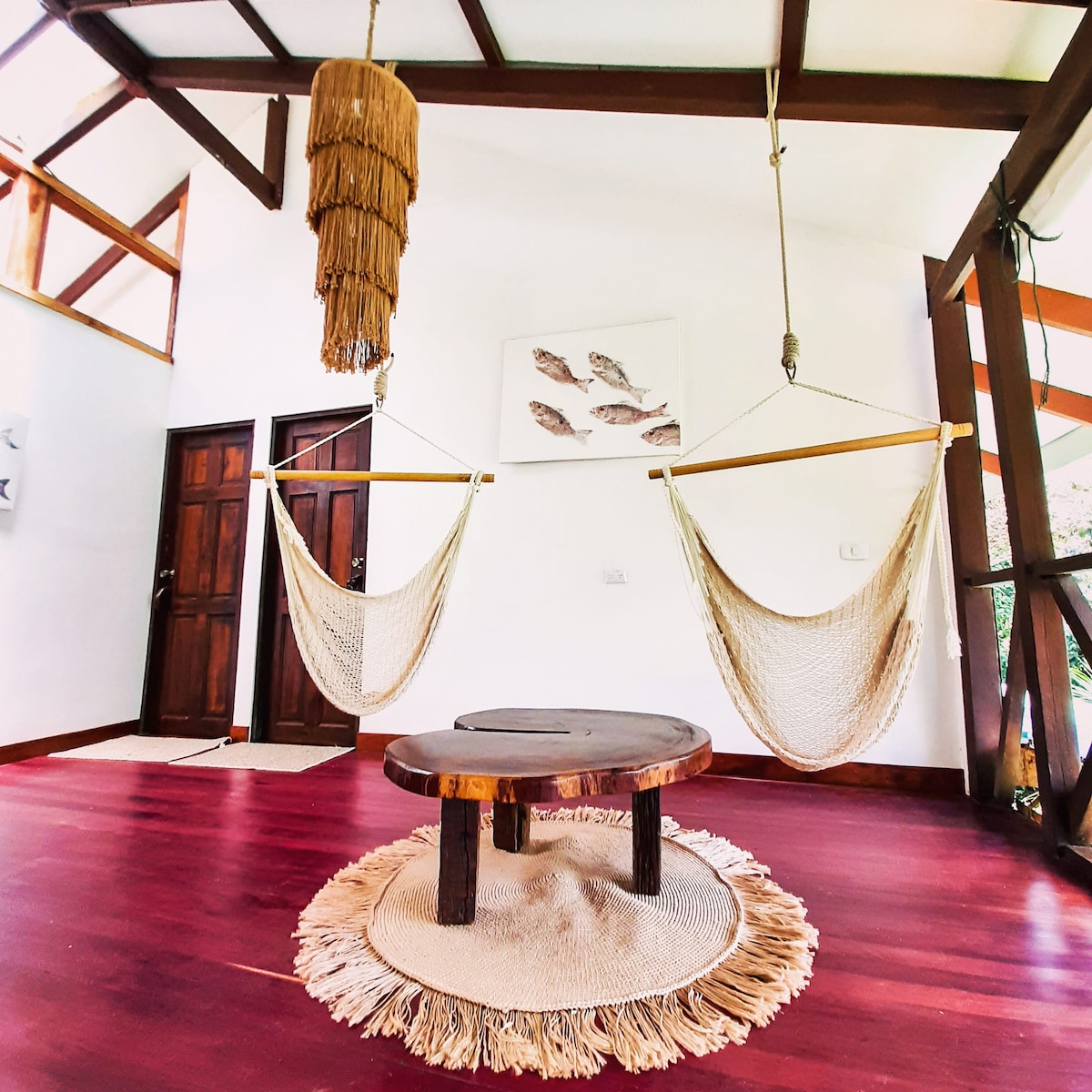 Elevated detached jungle cabin with view to the lagoon, ocean and Caño Island. Traditionally built with white cane and decorated with wall paintings. Relax and enjoy beautiful sunsets from the hammock or your balcony. Take a canoe and paddle across the lagoon to get to a lonesome beach. Follow the footprints of the Tapir along the bamboo trail or hike to a mangrove beach. We offer an own Cacao Tour, Canoe Tour and Night Tour and organize tours to Corcovado or Caño Island, among others.