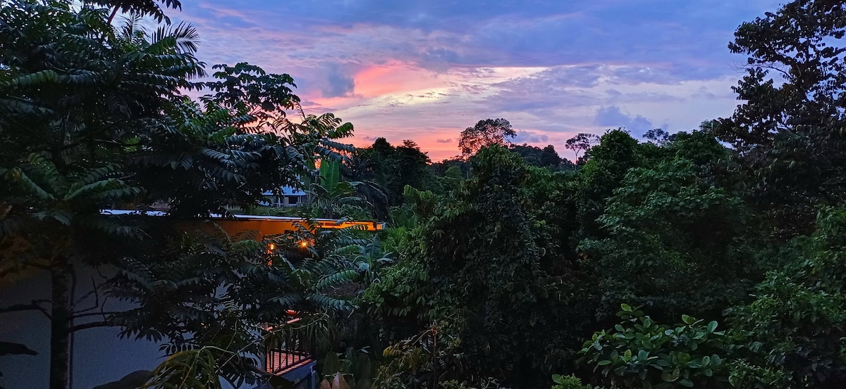 Welcome to Rooted in Love, your jungle casita with all the modern amenities to comfortably experience the jungle. This little bungalo is perfect for those wanting accessible nature yet connected to a traditional Tico village. From your room you can often observe the titi monkeys jumping tree to tree or magnificent birds on this beautiful reforested property. A yoga shala/ temple, silks, and bamboo merkaba for meditation are all available for your use. Come relax and heal in the rainforest!