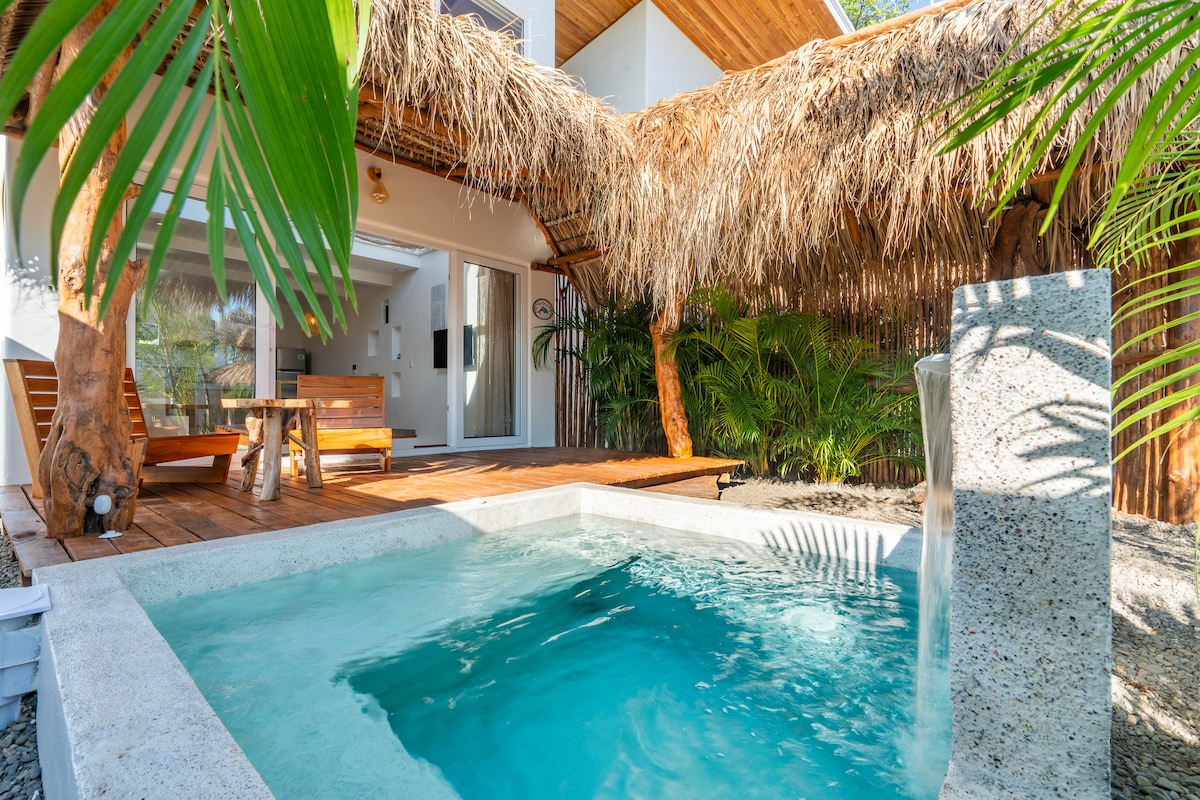 Escápate a un loft romántico con piscina privada, rodeado de naturaleza y a solo 20 m del mar. Ubicado en Playa Hermosa, Jacó, dentro del Refugio Nacional de Vida Silvestre, es el lugar perfecto para descansar y reconectar. Relájate en la piscina privada con hidromasaje y disfruta del atardecer con el sonido del mar. Con reserva previa, accede a clases de yoga, sauna (con costo adicional) y un baño frío revitalizante.