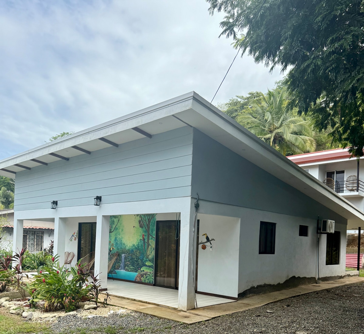 Modern suite surrounded by nature, just 2 min from famous surf beach Playa Hermosa (near Jacó). Comfortable space with 2 bedrooms (with A/C), 1 bathroom, and an outdoor covered kitchen/dining area. Relax on the terrace with garden views and spot white-faced monkeys, macaws, and toucans that visit daily. The guest suite is on the ground floor with private entrance but is part of our home where your host family lives. The fenced garden and parking are shared with us.