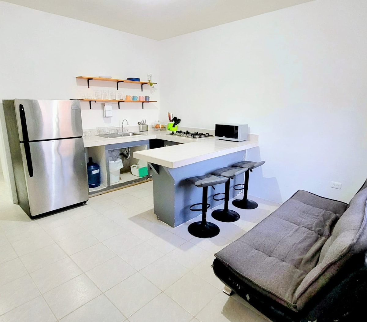 Un departamento con su estilo único a la orilla de la playa. En la planta baja, su patio esta conectado al amplio area común. Disfruta del ambiente familiar relajado, donde se escuchan las olas y la brisa. Equipado con cocina, baño, AC, calefacción, TV smart, cajon de estacionamiento en frente del edificio. En la recamara hay una cama King con una bicama individual. Cuando la bicama esta en uso se llena el cuarto (casi de pared a pared) con cama. En la sala hay un sofacama individual.
