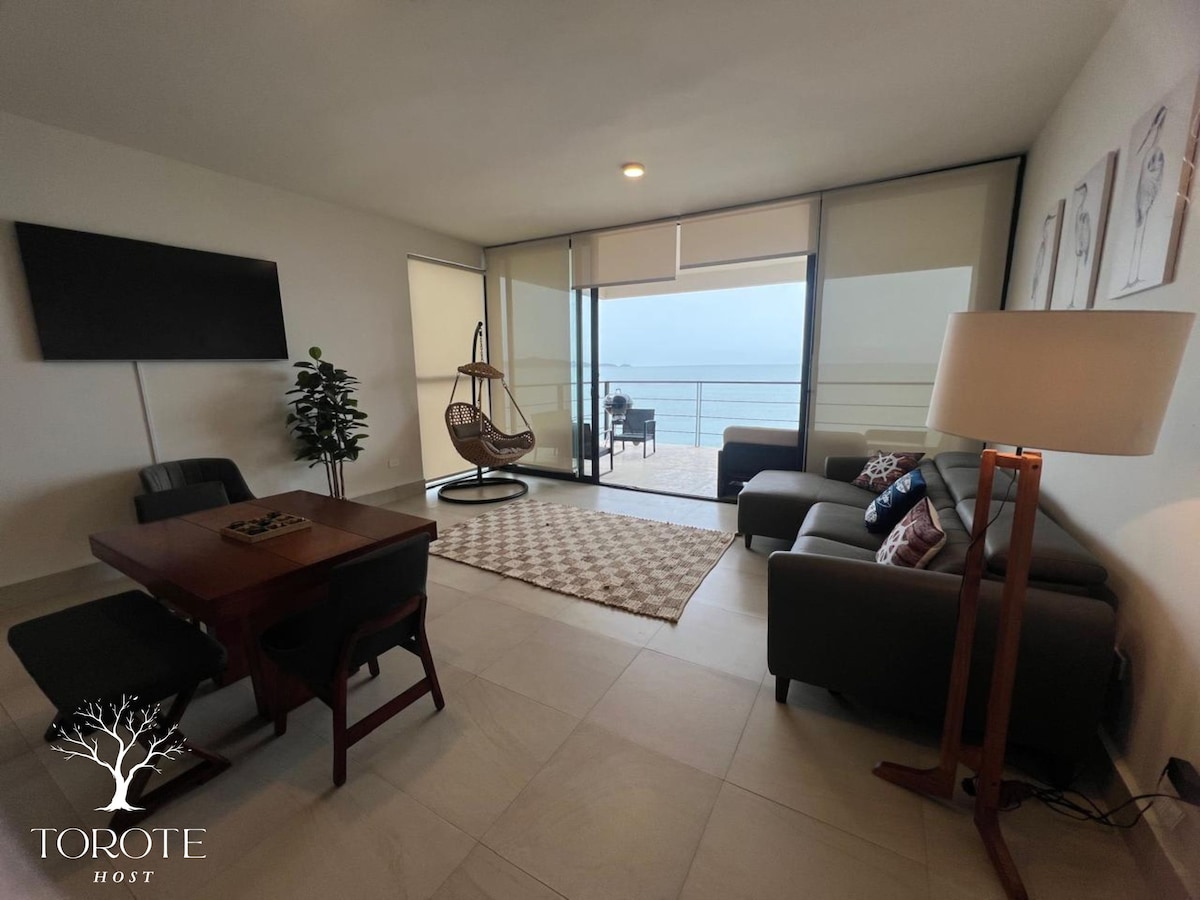 Departamento con vista de las montañas desde la recamara (con cama Queen y cama Individual), una sala cómoda (con dos sofacamas individuales), cocina equipada (microondas, refrigerador, estufa, ollas, platos, cubiertos, cafetera), y balcón privado con vista parcial al mar. Hay acceso al area común en la planta baja; una terraza amplia a la orilla de la playa con sillas cómodas, mesas, baño, asador y regadera. Ideal para 3 personas; máximo absoluto 5 personas. No mascotas. $500 por pers extra