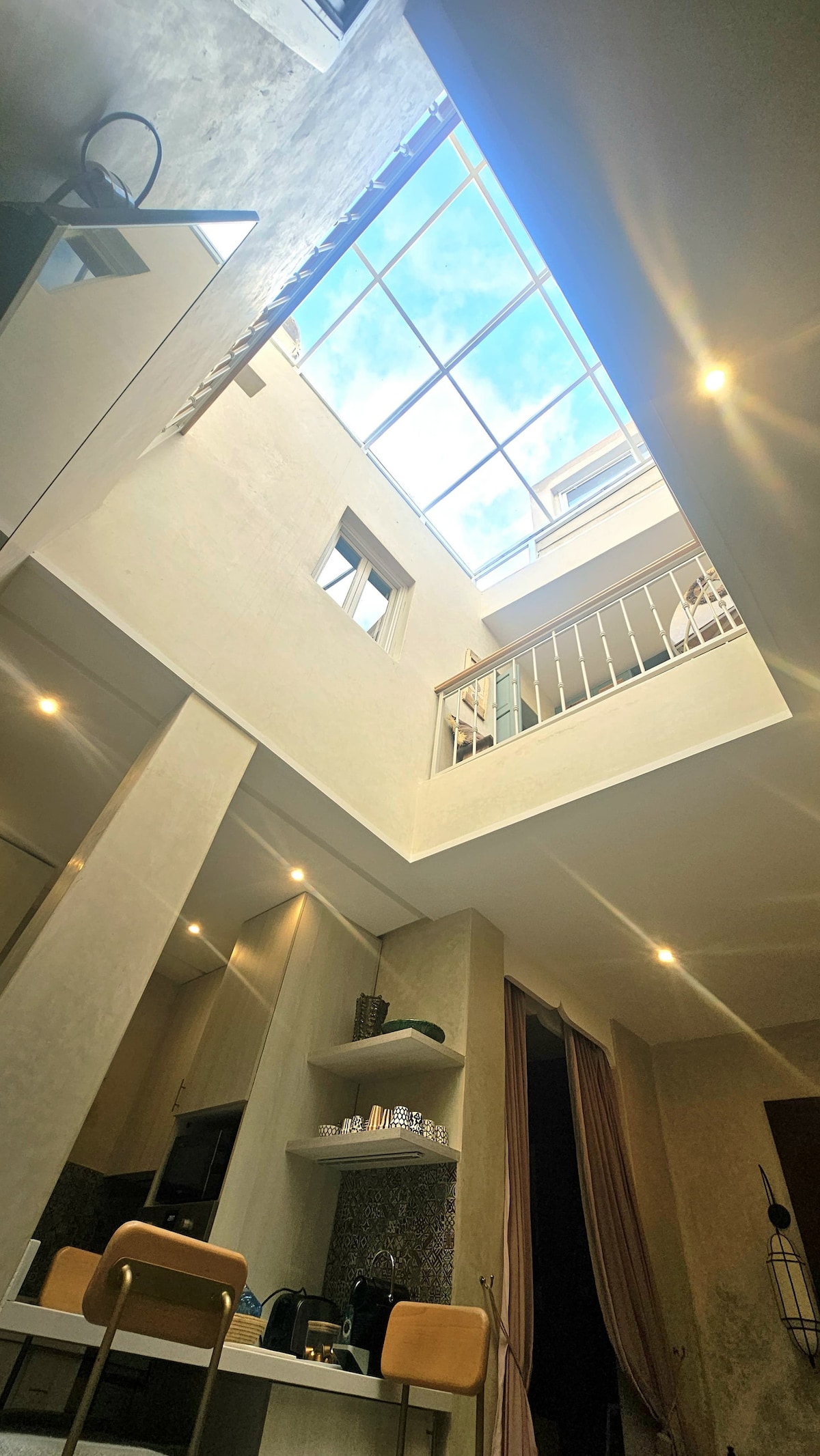 L'appartement entièrement privé se compose d'une chambre et deux salons à l'architecture typique marocaine avec un puit de lumière au plafond, d'une salle de bain privé et d'une cuisine entièrement équipée. L'appartement est climatisé. Il est en face du Palais Bahia et à 5 min à pied de la place JAMAA EL FNA et de ses souks. L'appartement est parfaitement isolé du bruit grâce aux fenêtres à double vitrage. Il se situe au premier étage.