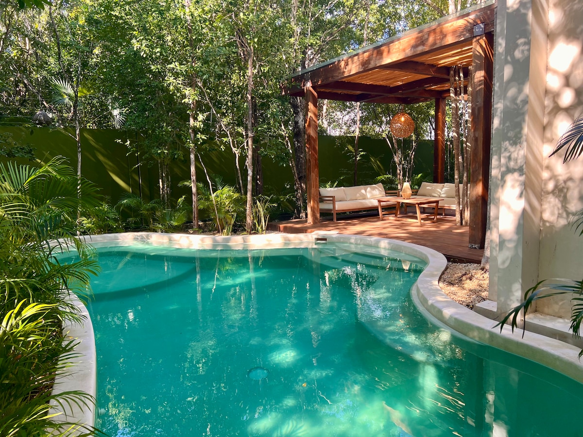 Hermosa villa en Condominio horizontal con total privacidad, seguridad y atención 24 hrs. Piscina XL, jacuzzi y jardín exclusivo para los huéspedes de la villa. A pocos pasos de restaurantes y locales, del Centro de Tulum. Ofrecemos servicios opcionales como transfer del aeropuerto, renta de bicicletas, masajes, chef y excursiones. NO hay construcciones cercanas, por lo disfrutarás tranquilamente tu estancia. Todas las habitaciones tiene baño privado y vista hacia la alberca y jardín.