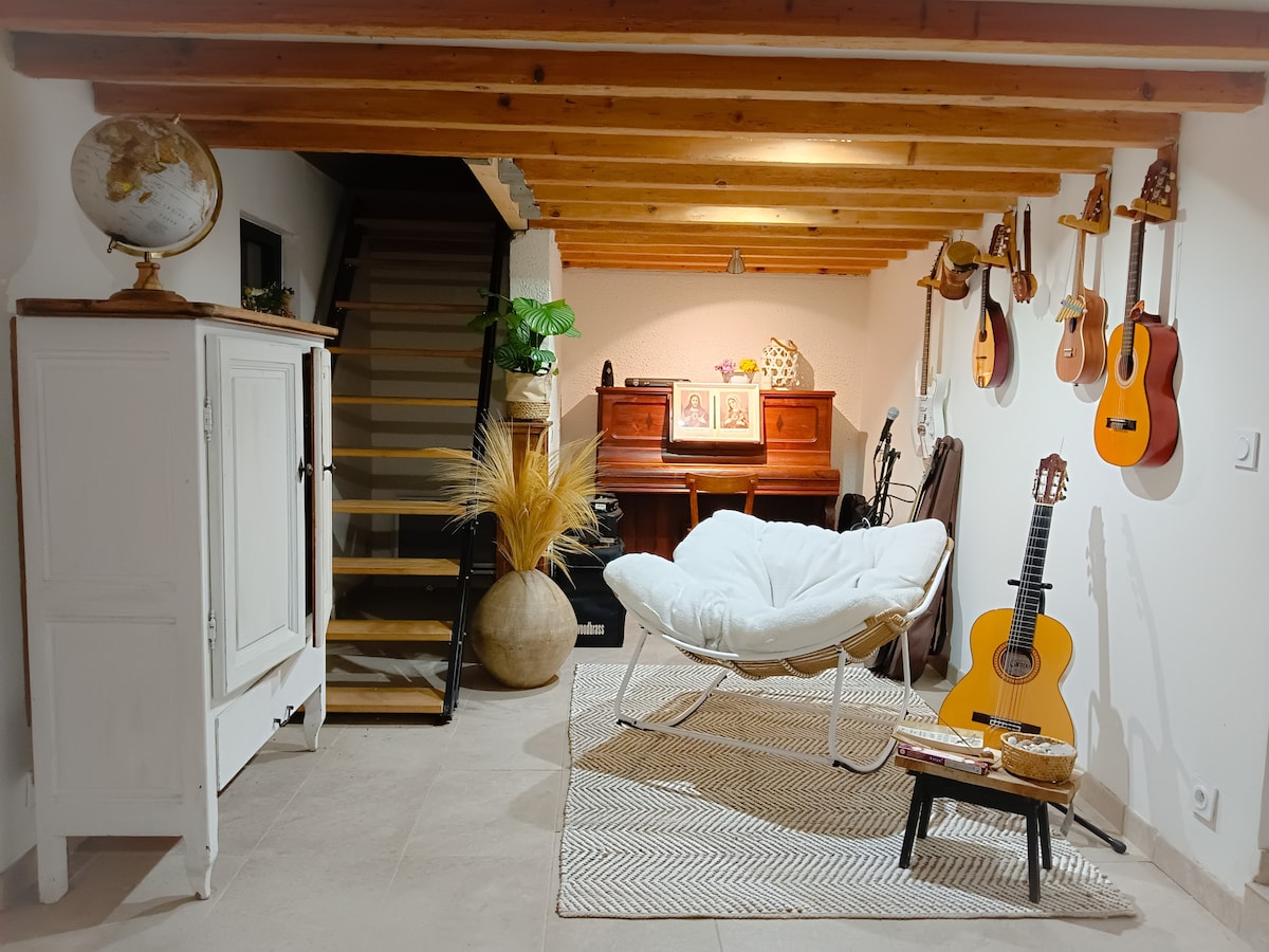 Studio indépendant climatisé, refait à neuf, avec mur en pierres et poutres apparentes, dans une ancienne grange rénovée en plein cœur du village de Baho, donnant sur un charmant jardin au calme et sans vis à vis. Entrée commune par la maison principale, (passage par le salon), ce studio de 40 m2 avec terrasse privative surplombe le jardin pour apéro ou détente. Lit double 160x200 cm, avec coin salon canapé tv, coin repas avec table bistrot, Kitchenette équipée et sdb privative avec wc.