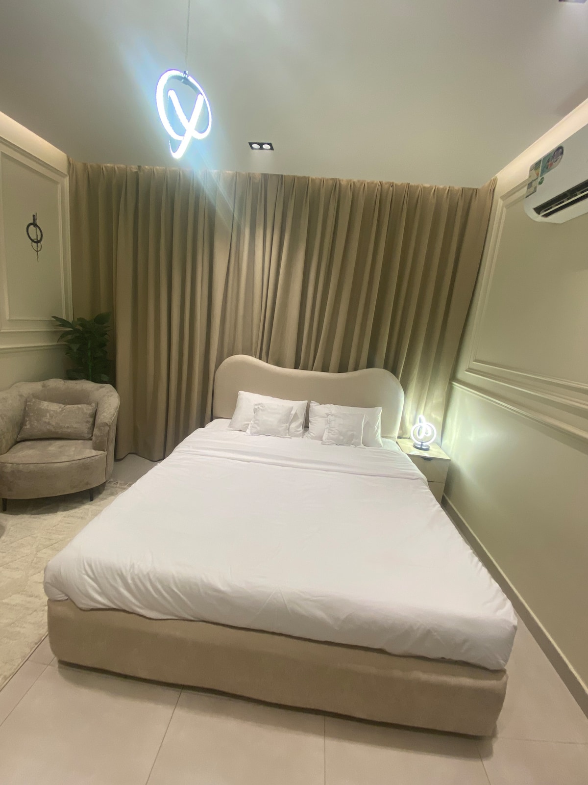Brand new, clean, hotel-style apartment with all hotel amenities and facilities. Located near all necessary services in South Jeddah. It includes: a living room, a TV, a kettle, a coffee machine, towels, shampoo, soap, a wardrobe, clothes, fragrances, a microwave, a refrigerator, additional lighting, additional bedding, shower gel, a hair dryer, and an iron.