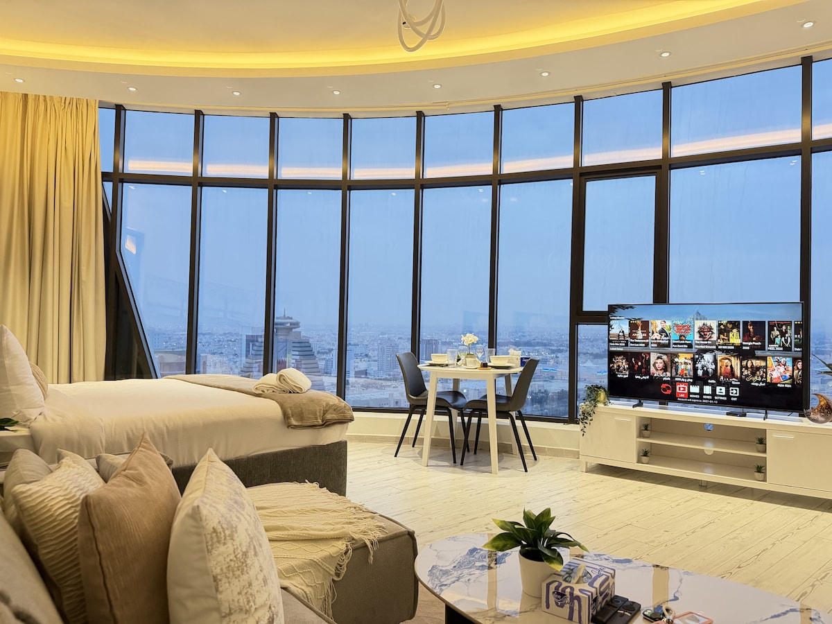Experience a luxurious escape in the heart of Seef, Bahrain. This fully furnished apartment offers both sea and skyline views, making it the perfect stay for solo travelers or couples seeking a calm, stylish and connected space. Inside the Apartment: 1 Master bedroom with king-size bed & bathroom. Bright living area with a guest toilet. Smart TV with satellite cable. Fully equipped kitchen with coffee corner. High-speed 5G Wi-Fi. Balcony with table and two chairs.