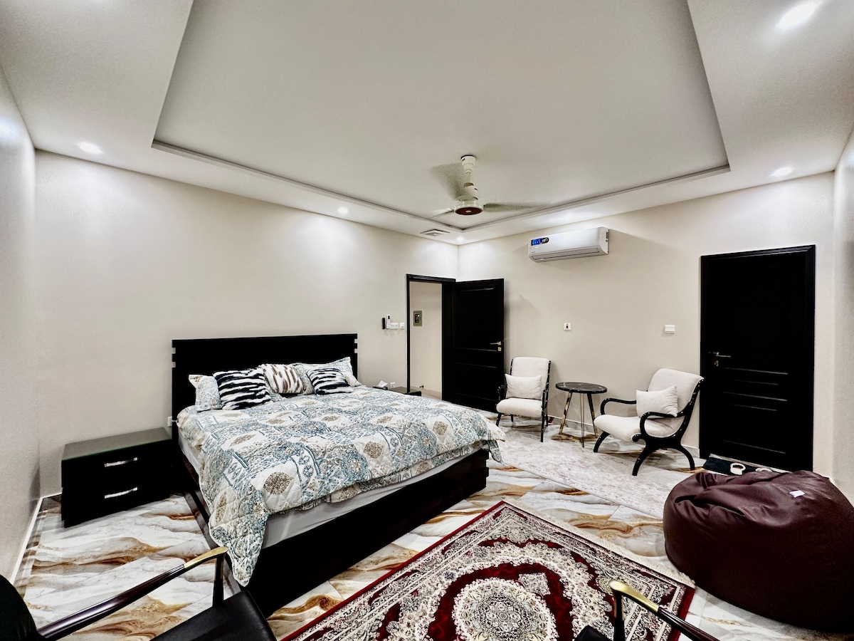 Best place for families travelling to Lahore. Gated society with high security for safety of residents Many restaurants are nearby, McDonald's is also near. Top bakeries of Lahore Jalal Son, Cakes and Bakes are at 1 minute distance. Horse Riding club and 3 lush green parks at walking distance. Hospital within Society Important "US$ 7 shall be charged for AC per room per night.** AC charges are not included in the rent. For long Stay actual meter reading will be charged @65 PKR per unit.