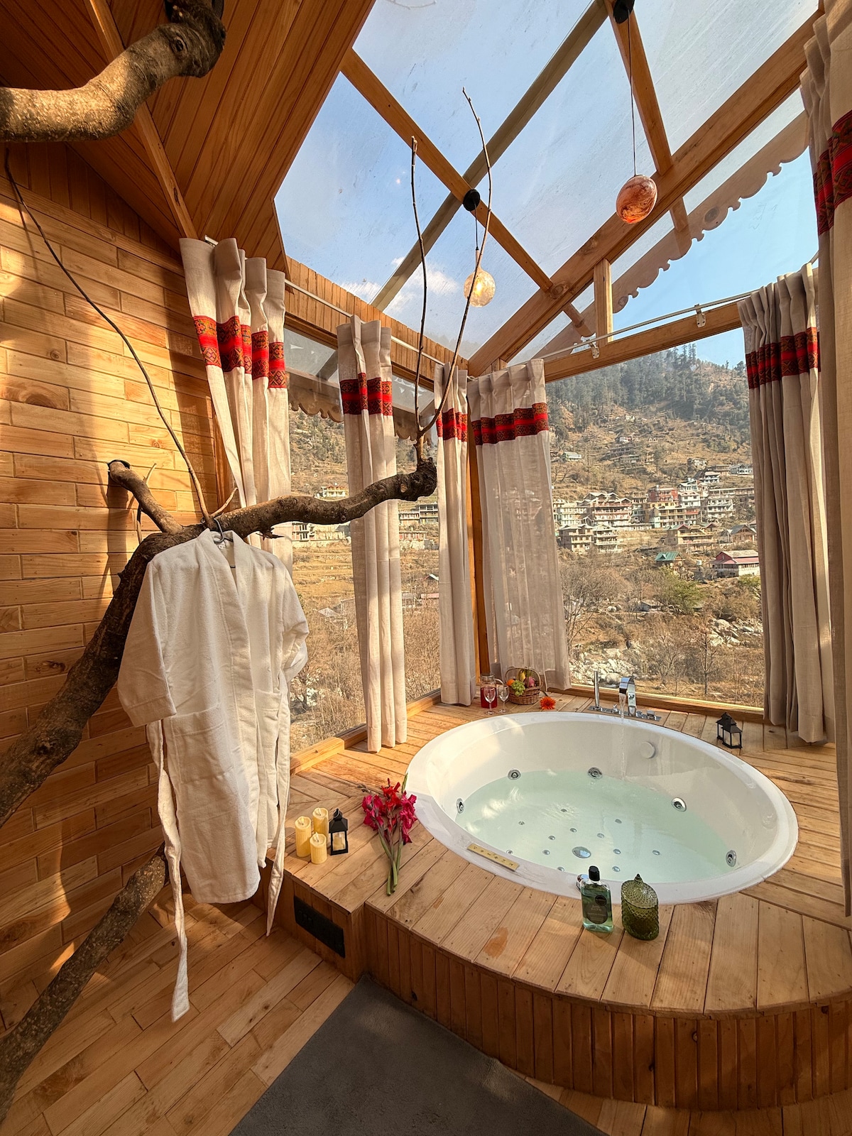You'll love this unique and romantic escape. This cozy Treehouse in Tandi: Above the Clouds, wrapped in Mist. This is a place for dreamers. A sanctuary. A space where the wind tells old stories and the quiet feels like an embrace. Whether you’re curled up in bed or soaking in the jacuzzi, you’ll feel the magic of the Himalayas surround you. It is a 280-300sqft treehouse.