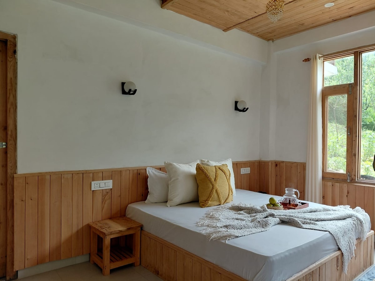 Get away from it all when you stay under the stars. Please note, there is 250 meters trek from parking spot to the property. We will pick your luggage. What You’ll Love - ★ Cozy master bedroom plus a Balcony ★ Beautiful wooden architecture ★ Wi-Fi ★ Power backup ★ Delicious in-house food service ★ Garden with bonfire area Please note - - Breakfast, meals, room heaters, bonfire, and other services are charged separately and are not included in the stay price.