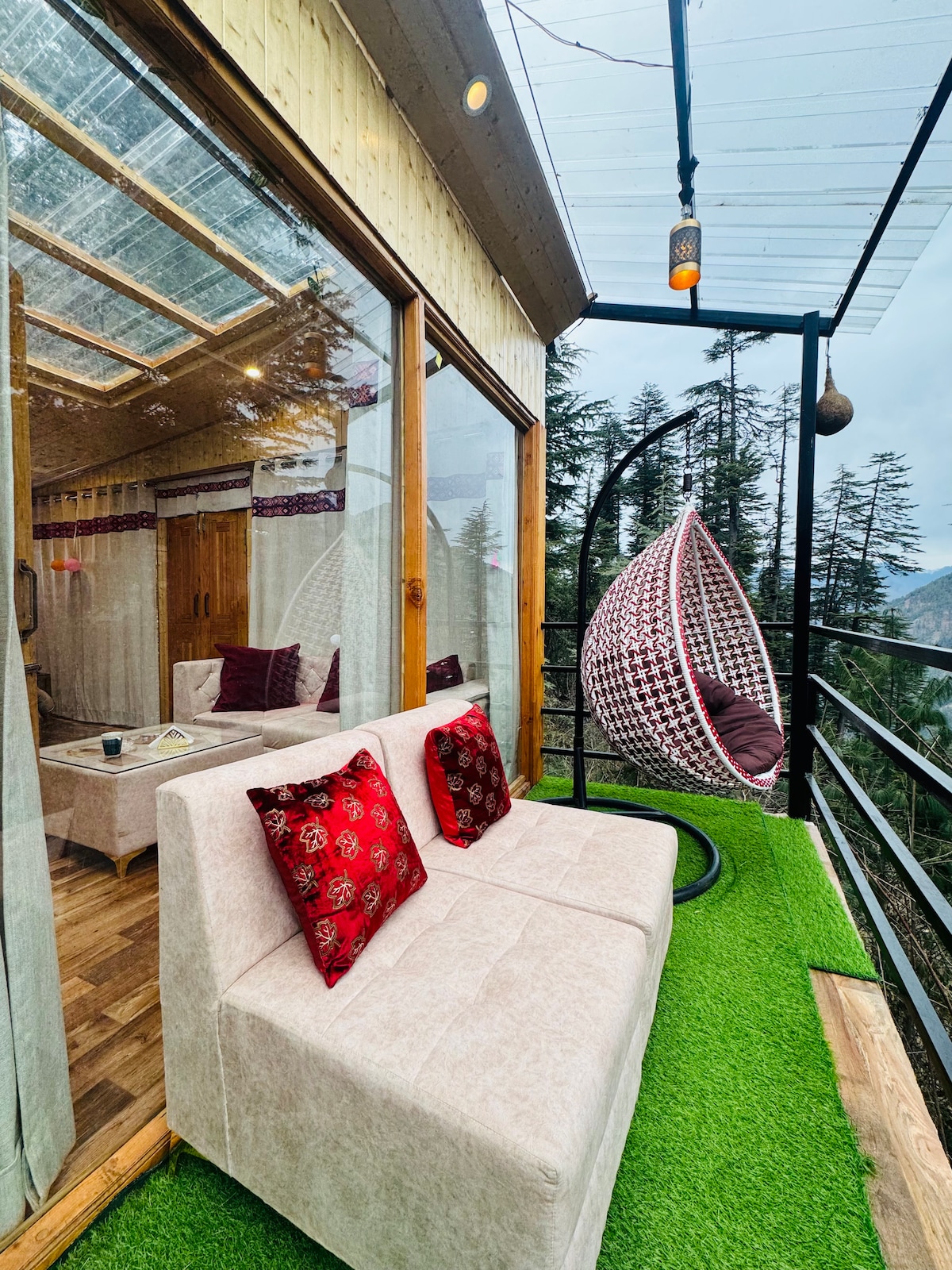Beautiful Wooden Jacuzzi Glass House with valley views, centrally located near the market, popular cafés, and waterfall — perfect for a peaceful getaway. # Spacious Master Bedroom # Private Jacuzzi with Valley View # Power Backup # Free Wi-Fi # Bonfire Area # In-House Food Service # Surrounded by Nature # Free Parking Space Please Note: -There is 50mtrs Walk from the parking spot to the property. we will pick your luggage. Breakfast, meals,room heaters, bonfire exclusive of stay price here