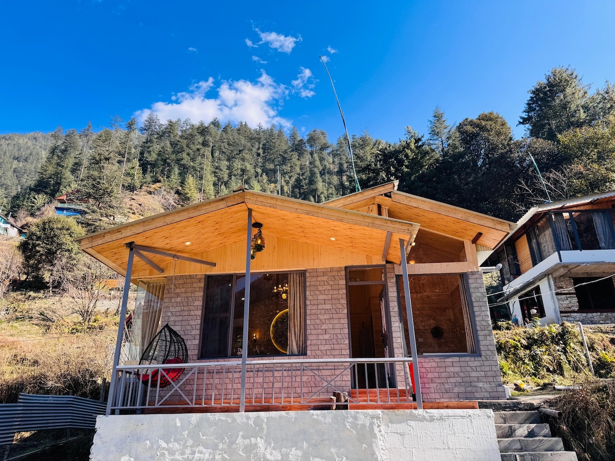 Just 6 km from the Jibhi Main Market, this wooden jacuzzi cabin offers a peaceful retreat. The highlight is the luxurious jacuzzi tub, 🛁providing stunning views of the surrounding mountains. It's perfect for unwinding after a day of adventure, making it ideal for romantic getaways or tranquil escapes. Whether you want to relax or explore, this cozy cottage ensures a memorable experience.