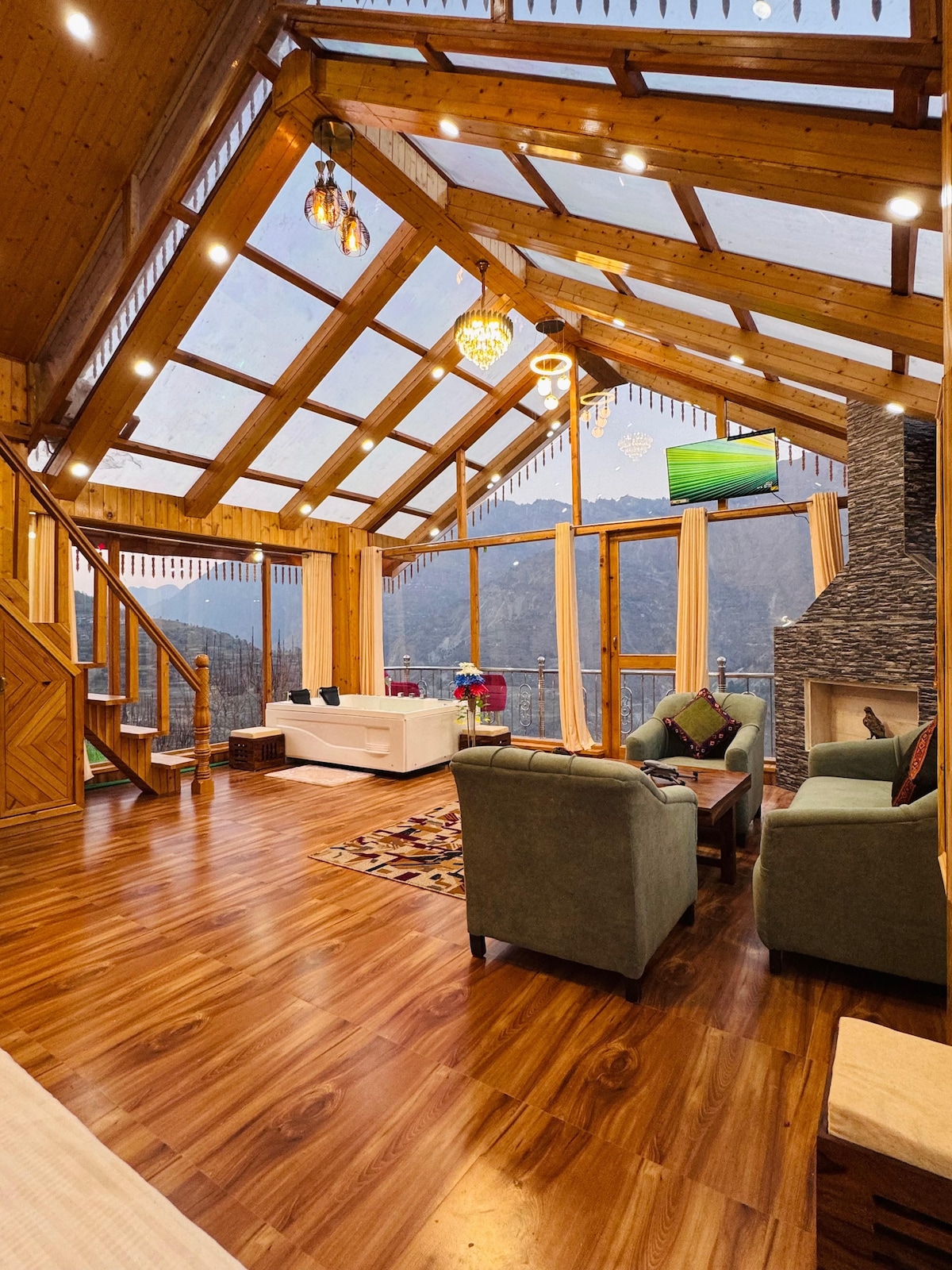This stunning glasshouse Airbnb in Jibhi offers an unparalleled escape. Nestled amidst towering deodar trees and boasting panoramic views of the Himalayan peaks, it's your perfect tranquil retreat. Enjoy peaceful isolation from the town's hustle, yet benefit from excellent main road connectivity.y setting of this romantic spot in nature.