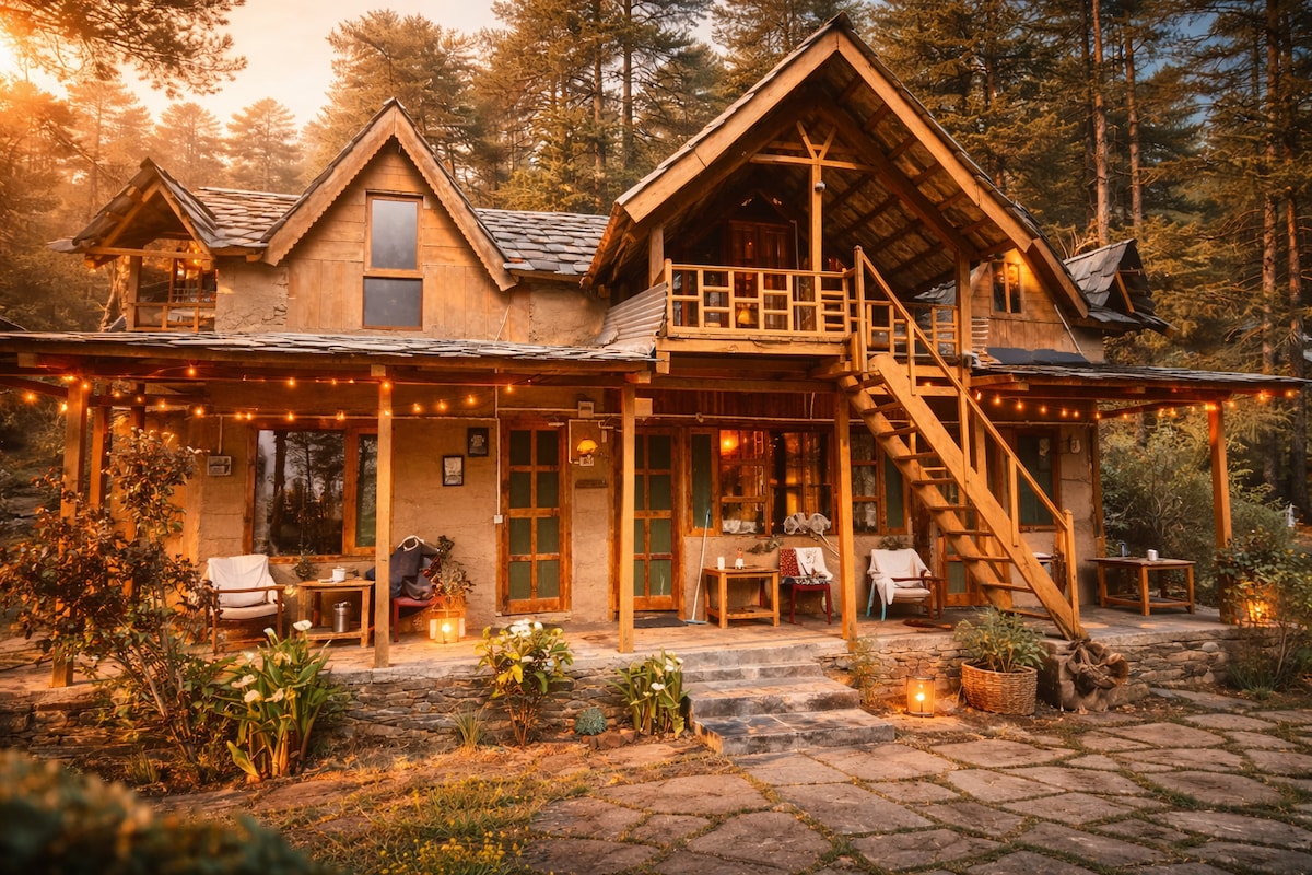 “Into the Woods Eco lodge in the middle of Apple orchards and forest with stunning views.” ★ Rustic Pinewood Architecture ★ Panoramic Views of Forests & Mountains ★ Eco-friendly Stay . ★ Wi-Fi ★ Power Backup ★ Fresh, Home-style organic Food ★ Bonfire Area ★ Indoor Fireplace & Dining Area ★ Organic Garden Surroundings Please note:- There is 500 meters trek down from parking spot to reach at property, Your luggage will be carried by us.