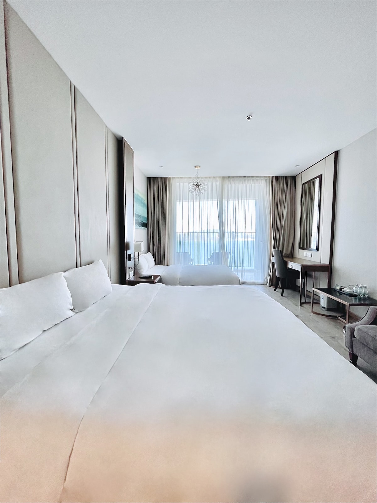• Bright ocean-view studio located in the very heart of Nha Trang • Private balcony with open sea view • Hotel-style bed with crisp white linens for ultimate comfort • Dedicated work desk with natural light – ideal for workcation • Calm, clean, and healing interior with warm modern design • High-speed Wi-Fi suitable for long stays and remote work • Steps to the beach, cafés, restaurants, nightlife & shopping • Perfect for couples, digital nomads, and extended stays