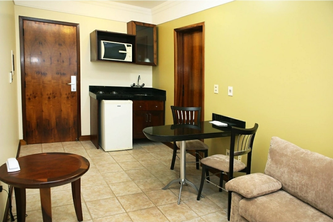 Hospede-se em um Apartamento super prático e completo com estrutura de hotel na melhor localização da cidade, a poucos metros dos melhores restaurantes de Joinville. Ideal para estadias práticas e confortáveis. Condomínio com Piscina, Academia e Sauna. Estacionamento incluso no valor. Apto completo de 44 m² no condomínio / hotel Prinz. Quarto com cama de casal e TV Smart. Cozinha com micro-ondas, fogão elétrico, frigobar, cafeteira, chaleira e utensílios. Sala com sofá e mesa para 2 pessoas.