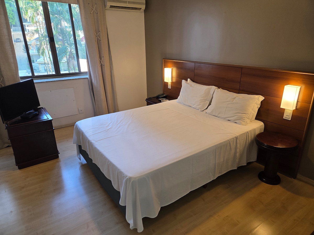 Café da manhã, Wifi, carregador de carro elétrico cortesia na hospedagem Taxa de turismo: R$ 3,00/diária ISS 3% incluso Diária por pet R$129,00 Estacionamento - R$ 30 por dia Quarto com decoração moderna equipado com: Ar condicionado quente e frio SmartTV led 32” Telefone Frigobar Caixa de som bluetooth JBL Cama box queen size Espelho de corpo inteiro Ampla janela com blackout duplo Enxoval de primeira linha Ducha com aquecimento central Ducha higiênica Secador Amenities biodegradáveis