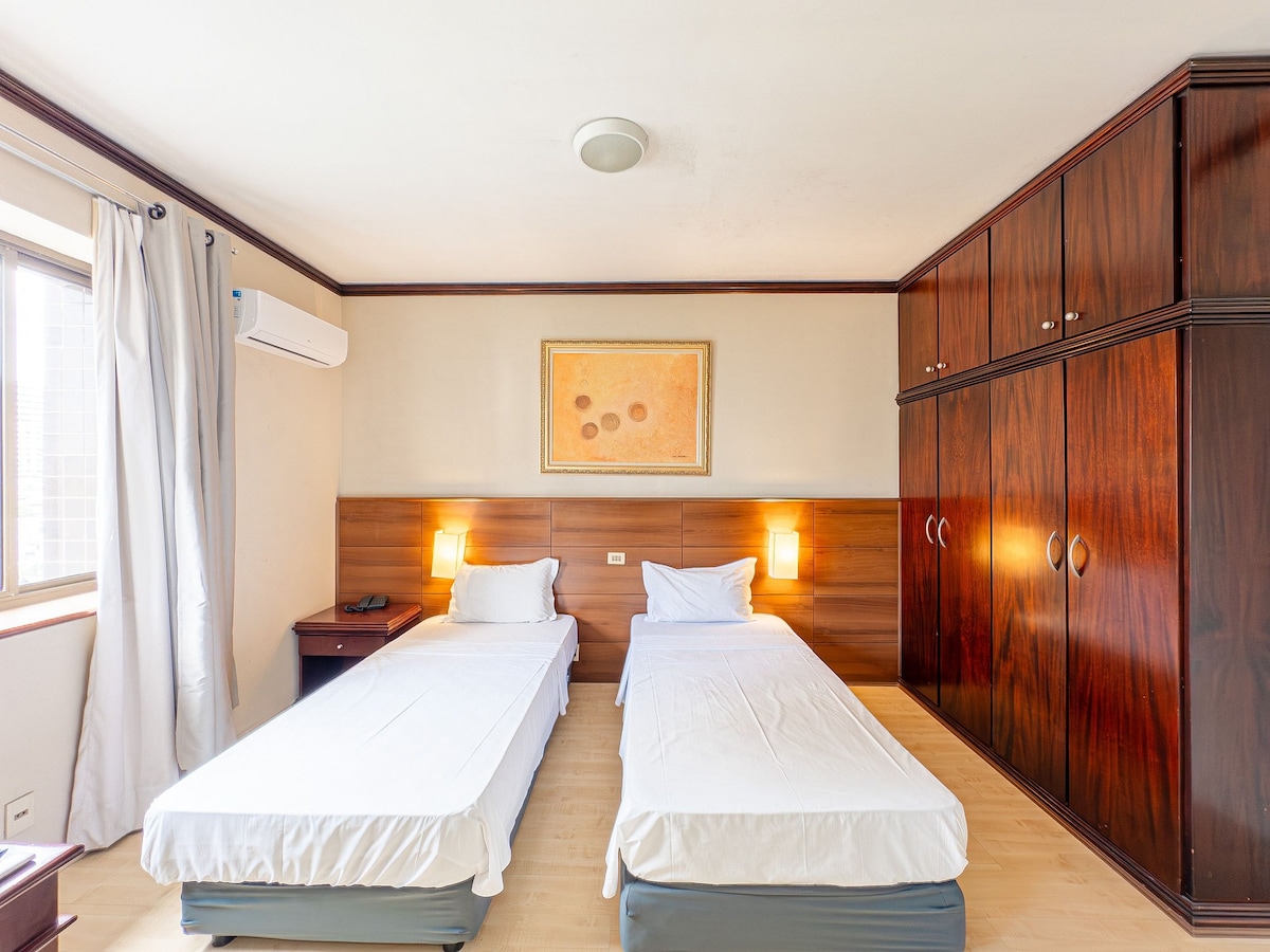 Apartamento localizado em um flat, com toda a infraestrutura de um hotel, café da manhã, limpeza, roupa de cama e banho, academia, Wi-Fi, estacionamento