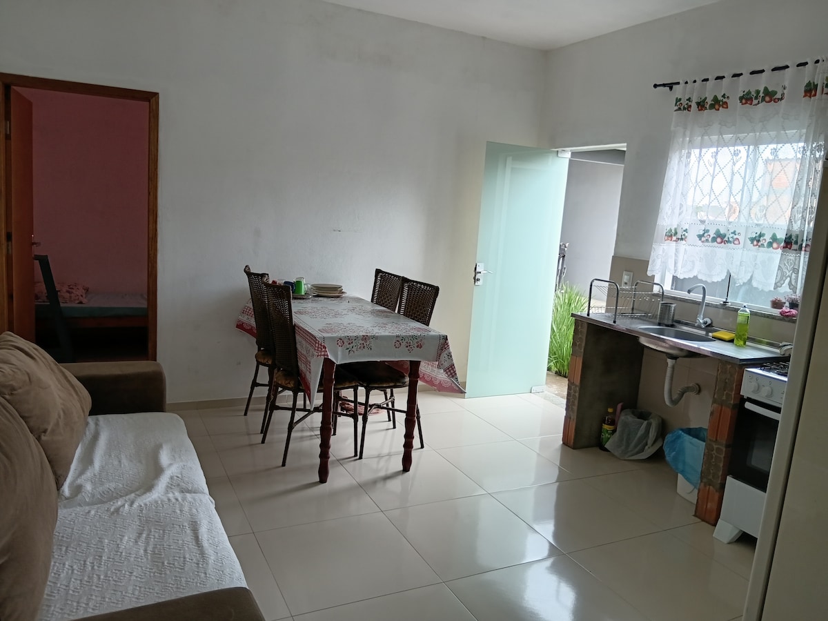 Aconchegante e cercada de natureza para até 8 hóspedes, possui: 3 quartos sendo 1 suíte ar condicionado, wi-fi 2 áreas de jantar (interna e externa), cozinha e varanda com churrasqueira Ideal para quem gosta de pescar! Pela rua dos fundo é possível acessar uma praia (distância de 50 metros) Estacionamento: vaga para 2 carros Algumas distâncias: 5km Forte Marechal Luz 12km Enseada 15km Prainha 20km Centro Histórico