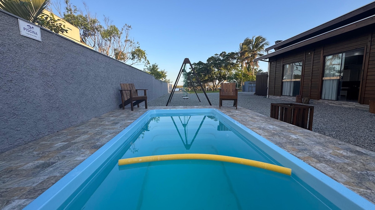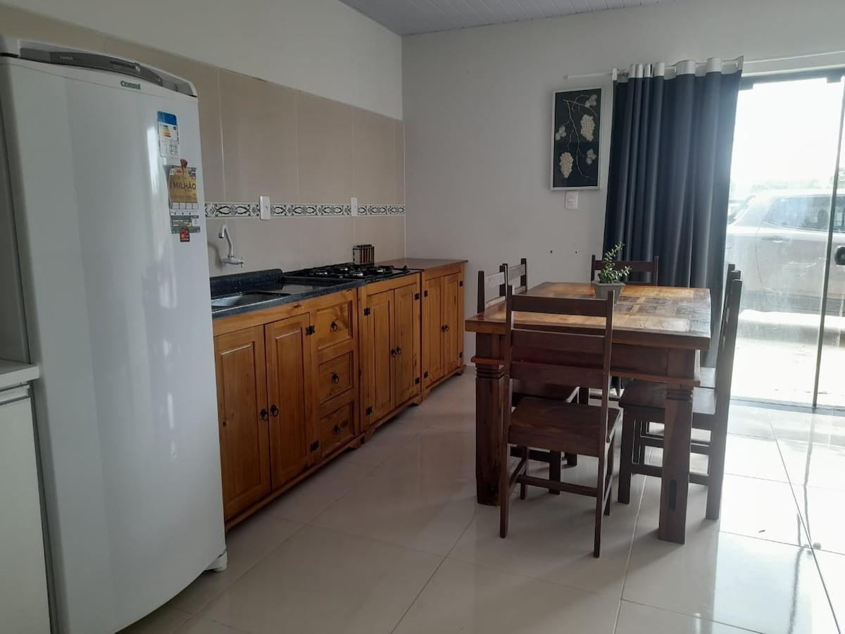 Aconchegante e cercada de natureza para até 8 hóspedes, possui: 3 quartos sendo 1 suíte ar condicionado, wi-fi 2 áreas de jantar (interna e externa), cozinha e varanda com churrasqueira Ideal para quem gosta de pescar! Pela rua dos fundo é possível acessar uma praia (distância de 50 metros) Estacionamento: vaga para 2 carros Algumas distâncias: 5km Forte Marechal Luz 12km Enseada 15km Prainha 20km Centro Histórico