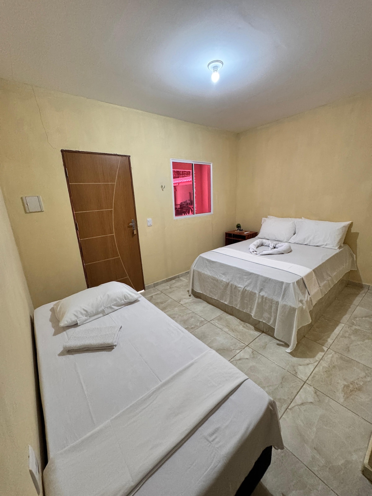 Nossos quartos quádruplos, com 2 camas de casal, oferecem espaço e aconchego para todos. São confortáveis, climatizados e decorados de forma simples e elegante, priorizando o descanso. Todos contam com banheiro privativo, toalhas macias, roupa de cama e uma atmosfera silenciosa que favorece o sono e o bem-estar. Cada detalhe foi planejado para proporcionar praticidade e aconchego — da iluminação suave às tomadas próximas da cama, frigobar e ventilador.
