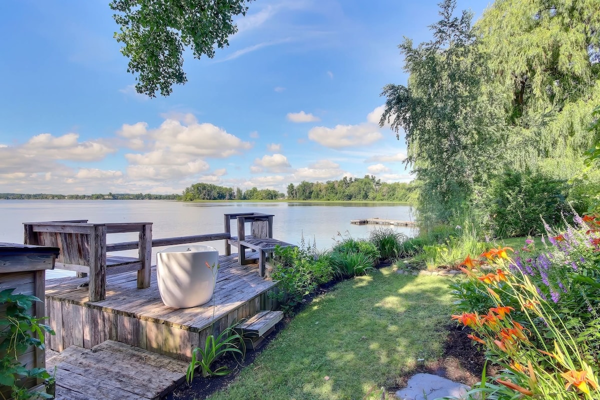 Spacious Lakefront chalet on Lac des Deux Montagnes in Ile-Bizard, Montréal, on nearly 2 acres of landscaped grounds and 200ft of frontage with a sandy beach about 40 minutes to downtown. Several canoes, kayaks and pedal boats available. In the winter, have a relaxing massage in the SPA / hot tub. 65" & 50" Smart TVs.
