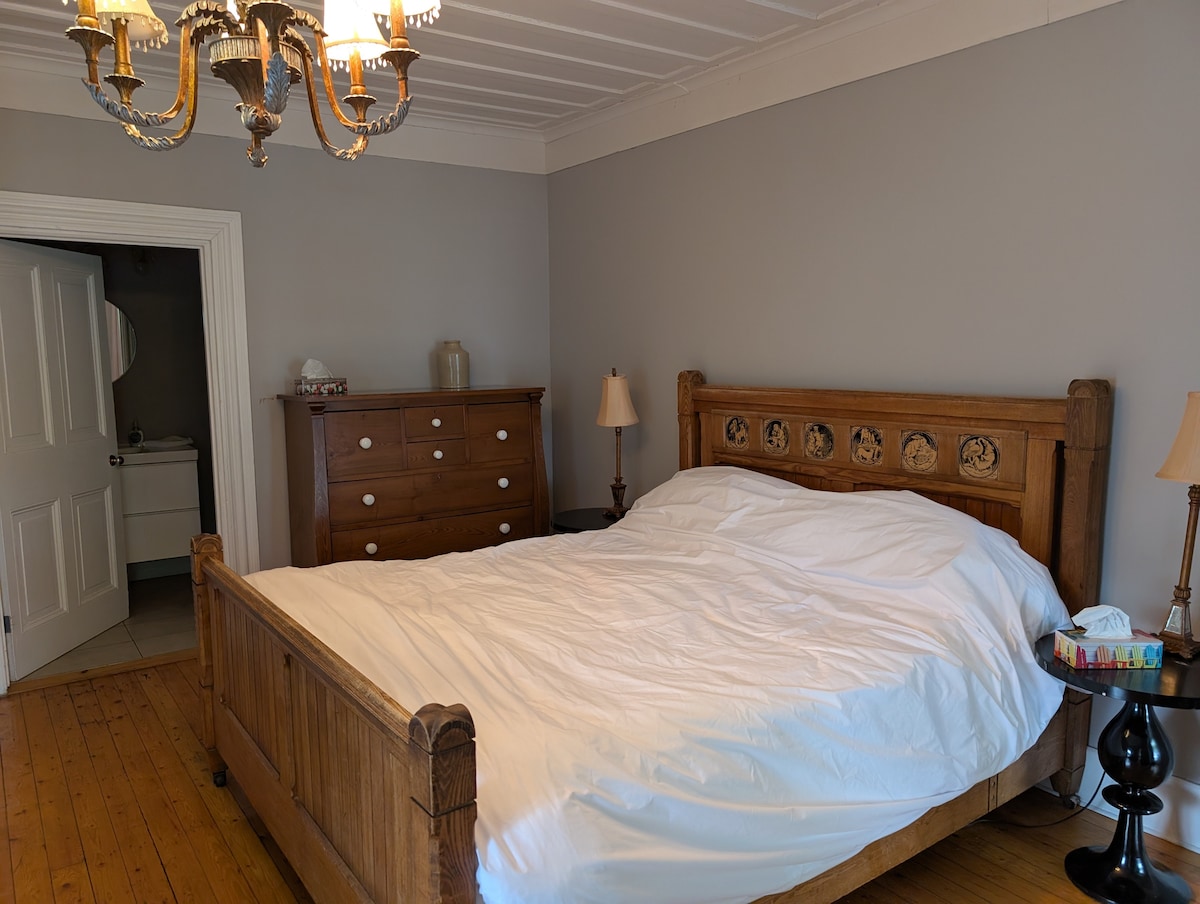 CITQ 317776 Chambre spacieuse offrant un lit Queen. La chambre est située au deuxième étage de la maison. Entrée privée, salle de bain partagée fraîchement rénovée, cuisinette équipée d'un réfrigérateur, d'un micro-ondes, d'une cafetière Nespresso et d'ustensiles. Le jardin offre un coin détente et un espace pique-nique et deux balançoires vous attendent à l'avant pour admirer le village et lire un bon livre!