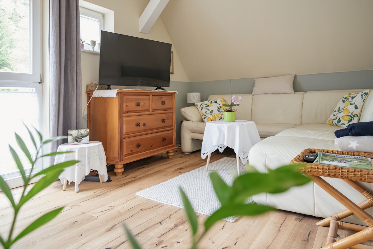 Das "Lerchennest" liegt separat im Obergeschoss des urigen Fachwerkhaus anno 1890. Der kleine Ort Aach ist nur 5 Autominuten vom Kurort Freudenstadt entfernt und bietet die ideale Basis um den Schwarzwald zu entdecken. Aber auch rund um das Lerchennest gibt es einiges zu erkunden: Den naturnahen Garten, eine Feuerstelle zum Grillen, eine Sauna zum entspannen, Ziegen füttern oder gemeinsam wandern, verschmuste Kater und allerlei mehr.