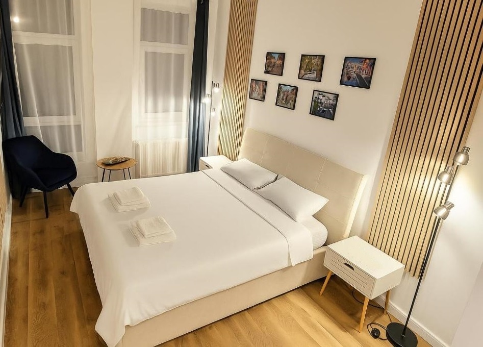 Un apartament de lux, potrivit și celor mai pretențioși turiști! Situat chiar în centrul Bistriței, la câțiva pași de majoritatea obiectivelor turistice, restaurantelor și cafenelor din zona istorica a orașului, apartamentul a fost recent amenajat, cu finisaje și dotări de cea mai bună calitate. Un dormitor de vis, unde să vă odihniți, o bucătărie complet utilată, și, bonus, poziționarea în inima orașului, într-o zonă liniștită, cu loc de parcare asigurat.