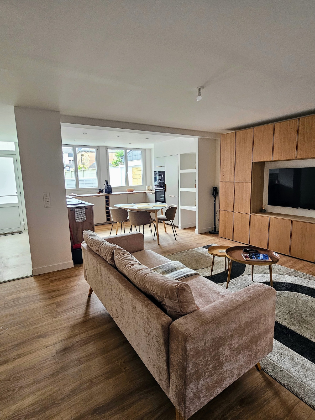 Vitré, quartier calme, proche de tous les commerces, du château et de la gare. Très joli appartement de 55m2 baigné de soleil grâce à son emplacement (3è étage sans ascenseur), rénové et décoré avec goût. Logement très bien équipé, composé d’une entrée avec placard, SDB, WC, chambre, un dressing et une cuisine ouverte sur la pièce de vie et le salon. Linge de maison et linge de lit fournis. Vitré, en plus de son patrimoine culturel se situe à 30 minutes de Rennes et ~1h de St Malo.