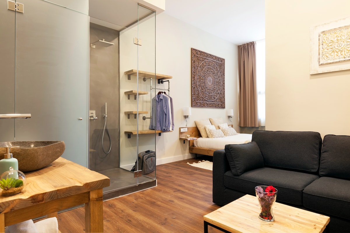The Junior Suite, located on an upper floor of the building, has an area of 40 m² with a maximum capacity of 3 people. It features a balcony with views of the Sagrada Familia and a private bathroom. The bedroom has a double bed and is separated from the living room. The living room is equipped with a sofa bed. For your convenience, you will find toiletries, a tea set, and a welcome water bottle.
