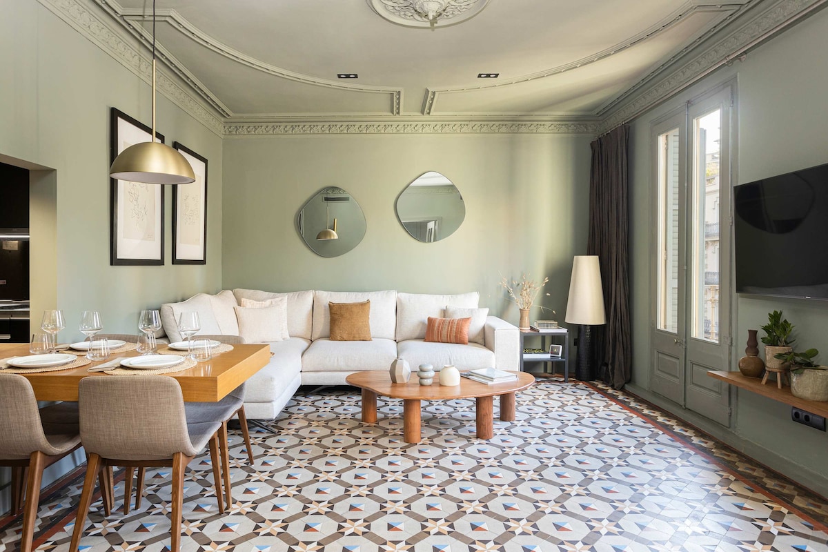 Bright, trendy two-bedroom, two-bathroom apartment with balcony in the central Eixample neighbourhood, very close to the Sagrada Familia, ideal for exploring the city on foot. Wi-Fi, TV with international channels and all modern comforts. The ceilings are high and the apartment is full of natural light. The furnishings are stylish and comfortable. The living room ceiling has the original Catalan Art Nouveau decorative moldings. Reception is open from Monday to Sunday from 9AM to 6PM.