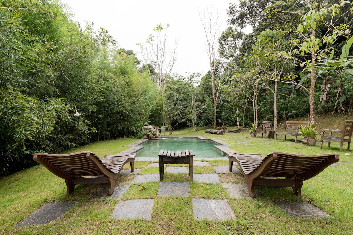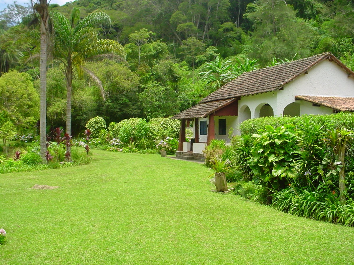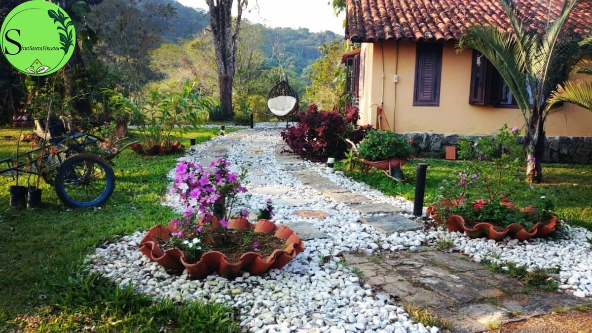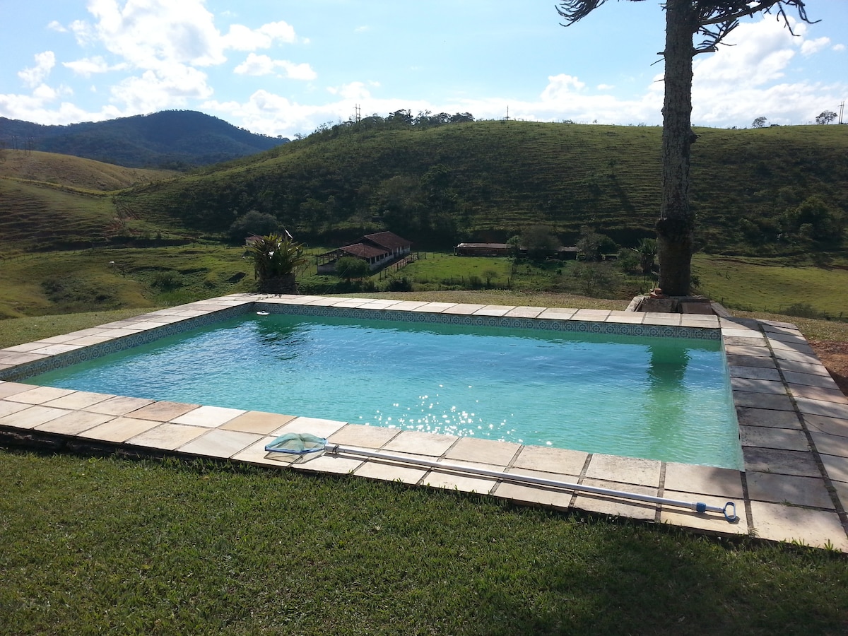 Ar livre e puro, natureza com muito verde! (internet fibra ótica de alta velocidade para seu home office) Casa colonial confortável e equipada. Lindo sítio com toda infra-estrutura e privacidade, para seu fim de semana com a família e amigos. Contato com a natureza e os animais, tudo verde e florido no meio de um vale, com frutos diversos pelo jardim. Piscina nivelada, sauna, churrasqueira e fogão/forno à lenha proporcionam uma estadia mais divertida.