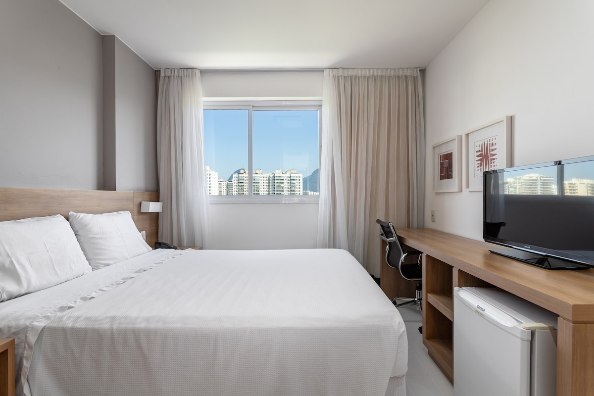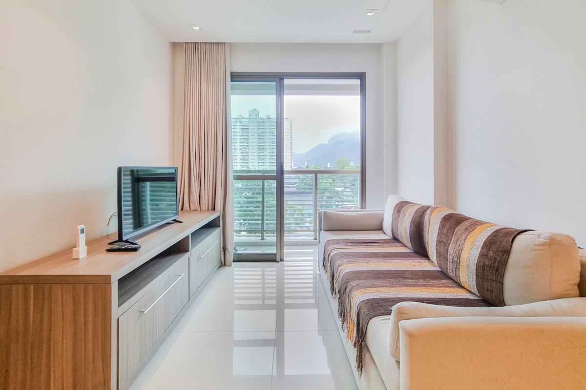 Modernly refurbished, comfortable, and luxurious single bedroom apartment. Conveniently located inside a hotel, just steps away from the beach, restaurants and Rio Sul Mall! Close to the most popular tourist spots, to public transportation, at the safest part of Copacabana (24 h police presence at hotel door!). This unit features all hotel services, including daily cleaning service included in the day rate. Stunning blend of modern luxury and unique architecture with the privacy of a forest view