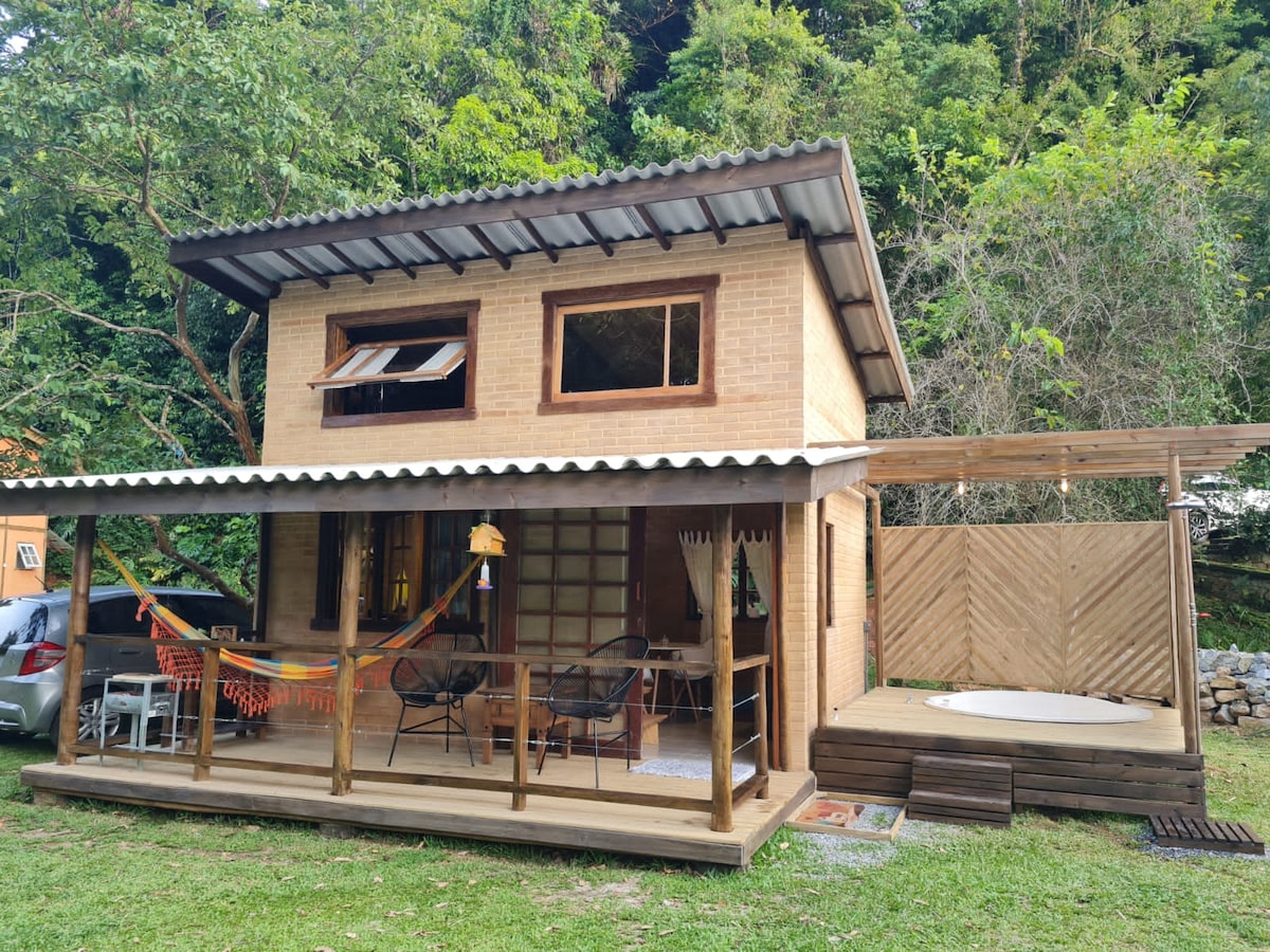 Bem-vindos á nossa casinha na Serra, onde o verde é a estrela principal! A varanda é um convite ao relaxamento, com rede e cadeiras confortáveis. Para tornar sua estada ainda mais inesquecível, na lateral do chalé, um deck com pérgola desfrute de uma confortável Jacuzzi dupla, perfeita para relaxar! Churrasqueira disponível! No jardim, árvores centenárias, uma sinfonia de pássaros , muitas flores, jabuticabas , laguinho !