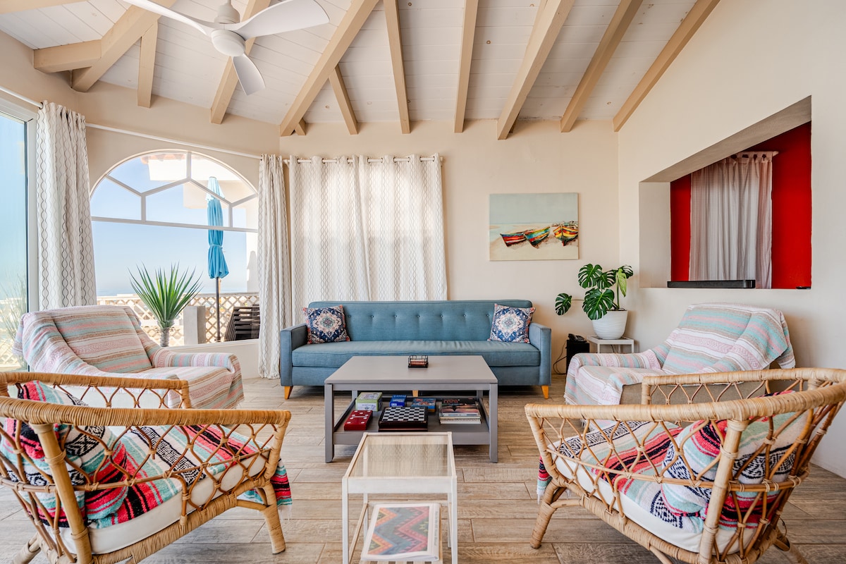 Set on a spectacular coastal hilltop in exclusive Cíbola del Mar, a safe, gated community only about 1 ½ hours south of San Diego, California and just 15 minutes from Ensenada and the Guadalupe Valley, The Baja House offers magnificent views of Ensenada Bay, with spacious gardens and patios. Wifi throughout makes an ideal place for those looking to work remotely. Our friendly adobe villa and artful interiors create a magical vacation space to relax and a home base to explore the region.