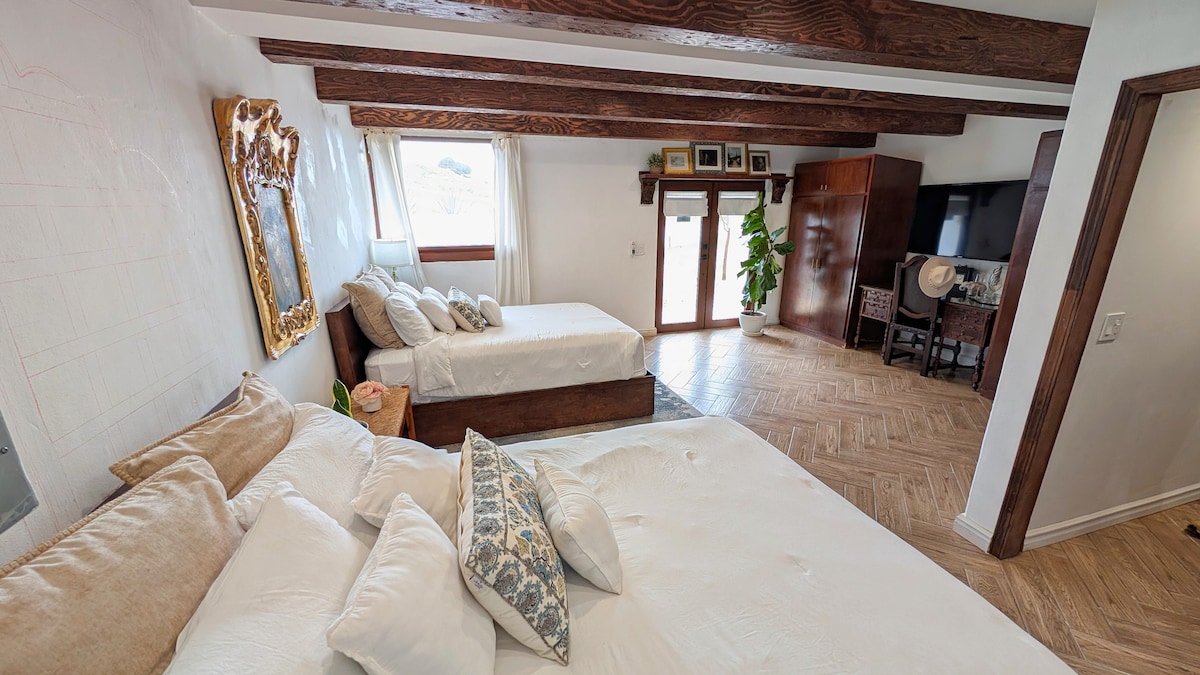 Enjoy a unique stay in a country house that has been part of the history of Valle de Guadalupe. It has a unique view and is surrounded by gardens, fruit trees and a vineyard. Includes Mexican breakfast and access to our fireplaces, room steam, gardens and grills. A few steps away is the Rondo del Valle winery, the Aires de Lavanda field and the King & Queen Cantina restaurant.