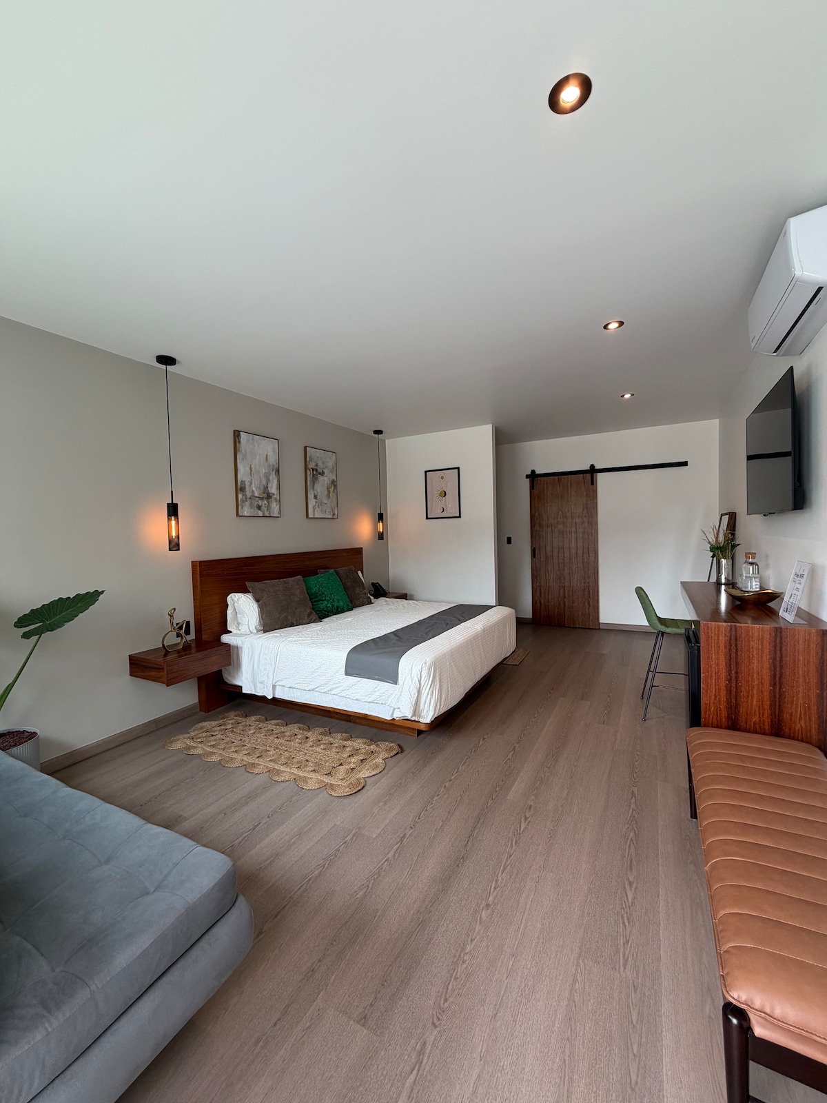 Completely new 40 m2 luxury room with unique amenities, designed to have a pleasant rest and experience the atmosphere of the Valle de Guadalupe. Suitable for two people in a Queen bed, air conditioning available, reading area with 2 sofas in a very cozy and clean space, coffee maker available. The bathroom is modern and spacious equipped with amenities such as: vanity mirror, soap, shampoo, conditioner, and hand towels.