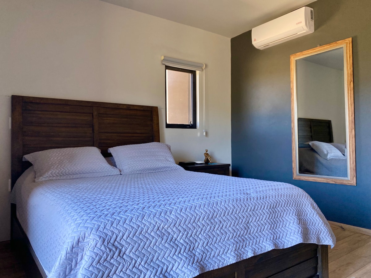 You will love this quiet queen bedroom & private bathroom. Very comfortable bed w/fridge and a large private patio overlooking the ocean and pool. Only 100 yards from the beautiful 10 mile long beach in front of you. Easy access to all patios and facilities. Including the Bar. 24hr security parking on site. Close to everything Ensenada has to offer, including the Wine valley, Buffadora, Malecon and Downtown. With 50 restaurants within walking distance you have found your home away from home