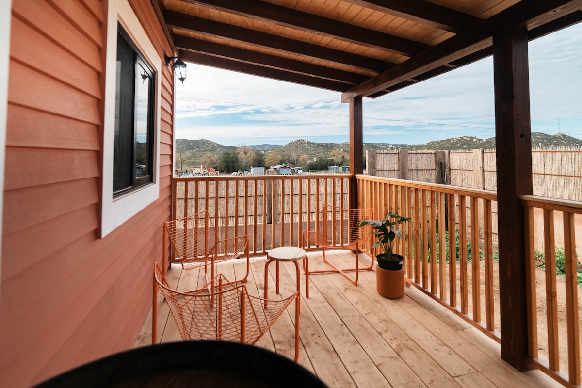 Room designed for a pleasant rest and to enjoy sunrises, sunsets, the sky, stars, and the moon from your terrace. Suitable for two people, with a Queen bed, air conditioning, fan, coffee maker, hot water, and high-speed satellite internet. Perimeter wall for privacy and security. The bathroom has a mirror, soap, shampoo, conditioner, hand towel, and hairdryer. Enjoy vineyards and wineries in Valle de Guadalupe. Safe and close to the region's most iconic places.