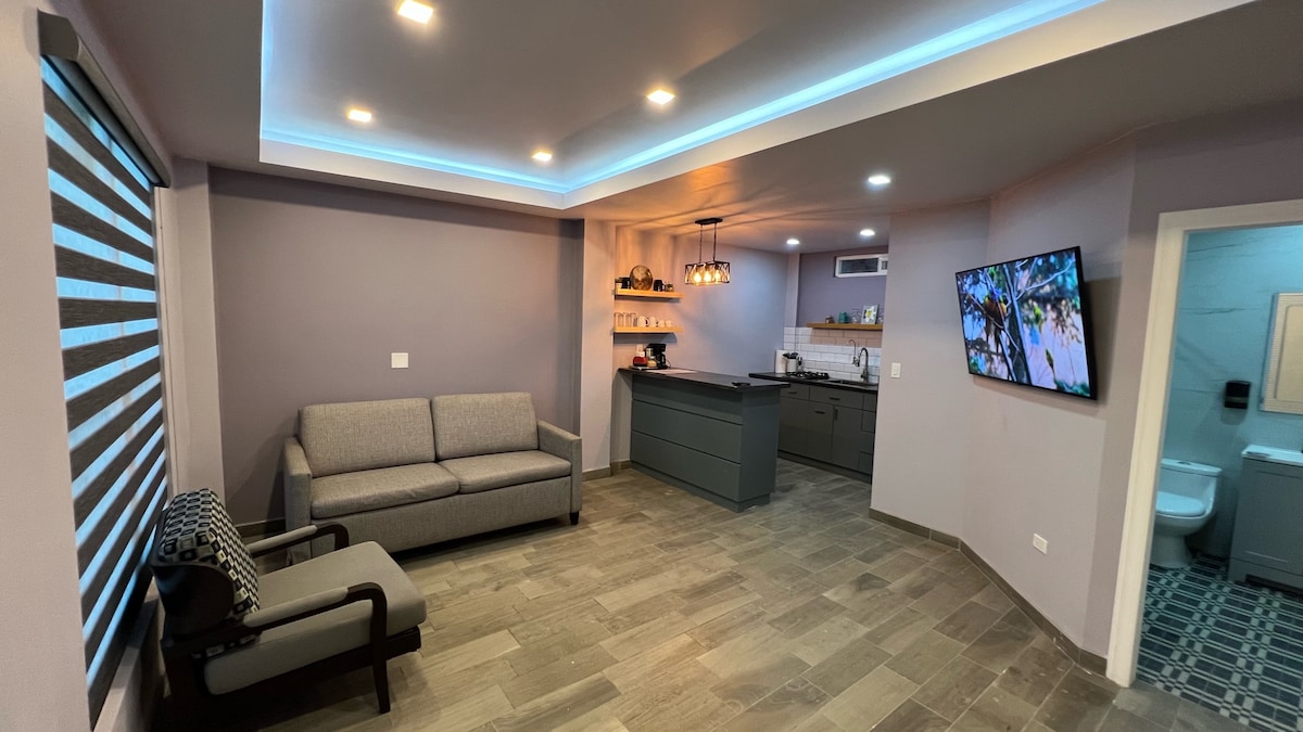 Room designed for a pleasant rest and to enjoy sunrises, sunsets, the sky, stars, and the moon from your terrace. Suitable for two people, with a Queen bed, air conditioning, fan, coffee maker, hot water, and high-speed satellite internet. Perimeter wall for privacy and security. The bathroom has a mirror, soap, shampoo, conditioner, hand towel, and hairdryer. Enjoy vineyards and wineries in Valle de Guadalupe. Safe and close to the region's most iconic places.