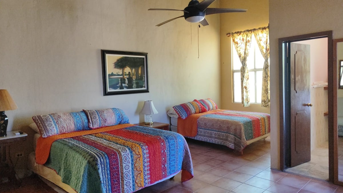 Vibrant brand new studio apartment inside an elegant Frida Kahlo-styled Mexican estate accessed via a walkway with 3 flights of stairs. It is on the ground level in front of the yard and garden. You'll have a queen bed, tv, full bathroom, full kitchen, and a dining/desk/bar area. You can hear the birds in the morning and sit out in the peaceful yard surrounded by greenery. In walking up to 2nd floor terrace you can enjoy the breathtaking city and ensenada port views.