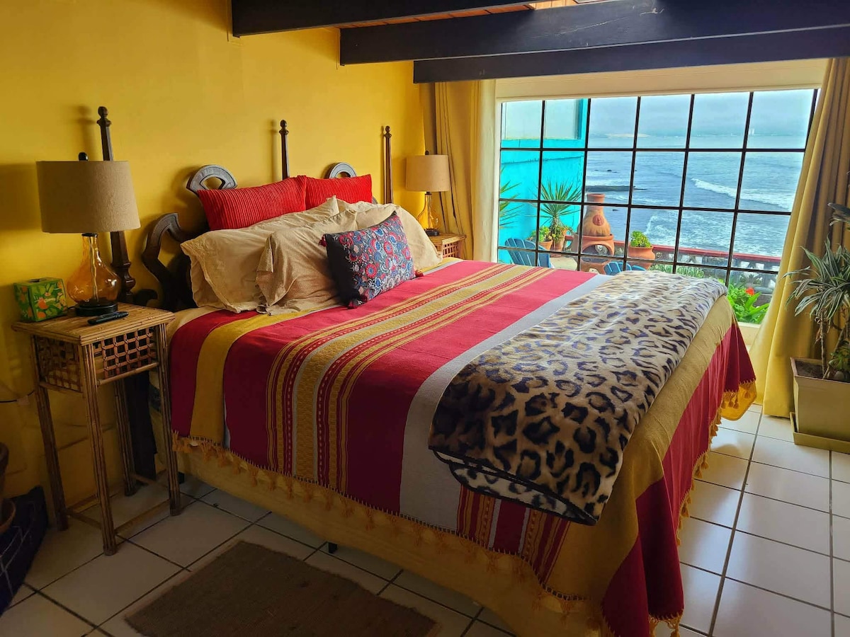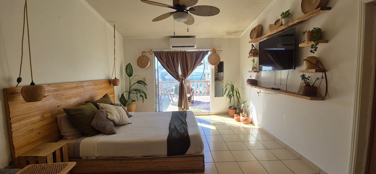 Mini suite con vista al mar y patio con área de fogata y asador Disfrutarás de la brisa y el sonido de las olas. Sencilla y acogedora dentro de una privada con solo 3 casitas. Adaptaba de forma independiente en la parte de abajo de una casa que también rentamos por Airbnb, cada quien tiene su espacio independiente. A unos pasos tenemos un hermoso mirador frente al mar (no hay acceso al mar) y un famoso restaurante, cervecerías y cafes, todo caminando. Con estacionamiento en área común enrejada.
