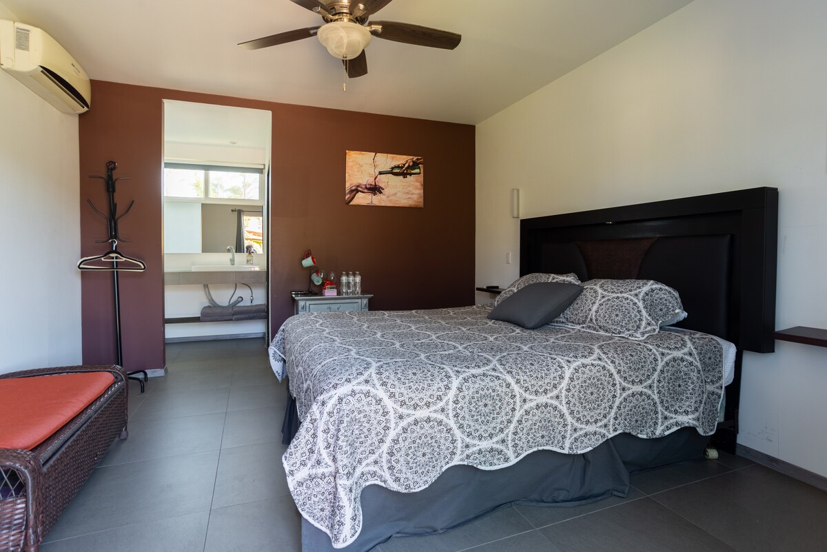 Tranquila habitación anexa con cama matrimonial, clóset y baño completo. La habitación es completamente independiente a la casa por lo que gozarás de la privacidad y comodidad ideal para parejas o viajeros solitarios.