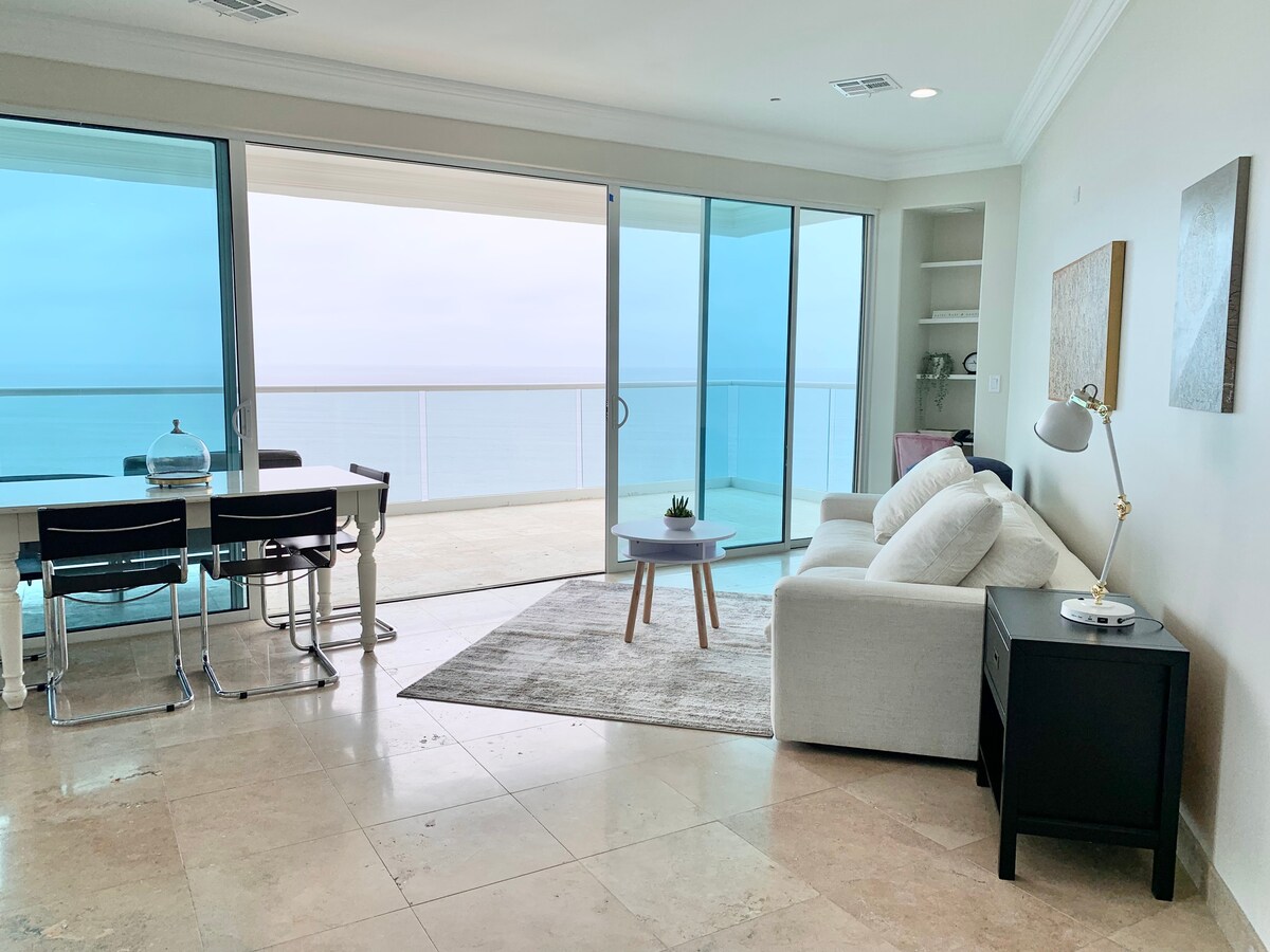 Private oceanfront luxury gated community with 3 pools, 8 jacuzzis, gym & spa. Condo includes 2 bedrooms, 1 bathtub, 2 bathrooms, living room, full kitchen, dinning room, washer & dryer. Smart TV's in every room and a dedicated workspace for home office. The oceanfront balcony with full 180 views from the 12th floor includes a Bluetooth speaker, lounge sofa, BBQ grill and a bar for the perfect happy hour sunset. Portable ice chest, chairs & towels for beach goers are included. Just relax!!