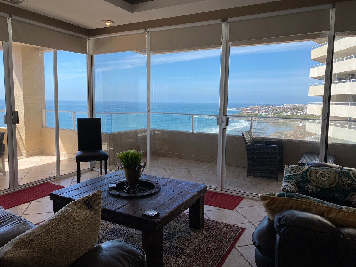 Luxury condominium with an overwhelming Ocean view!! Ideal for celebrating anniversaries, birthdays or simply enjoying with your friends or family in a relaxed atmosphere in one of the most exclusive places in Rosarito Beach. With access to a private sandy beach, 3 swimming pools and 5 jacuzzis. Experience the luxury and charm of La Jolla del Mar in the beautiful Playa Encantada, with easy access to restaurants, shops, golf and surfing, 5 minutes from the famous Papas & beer.