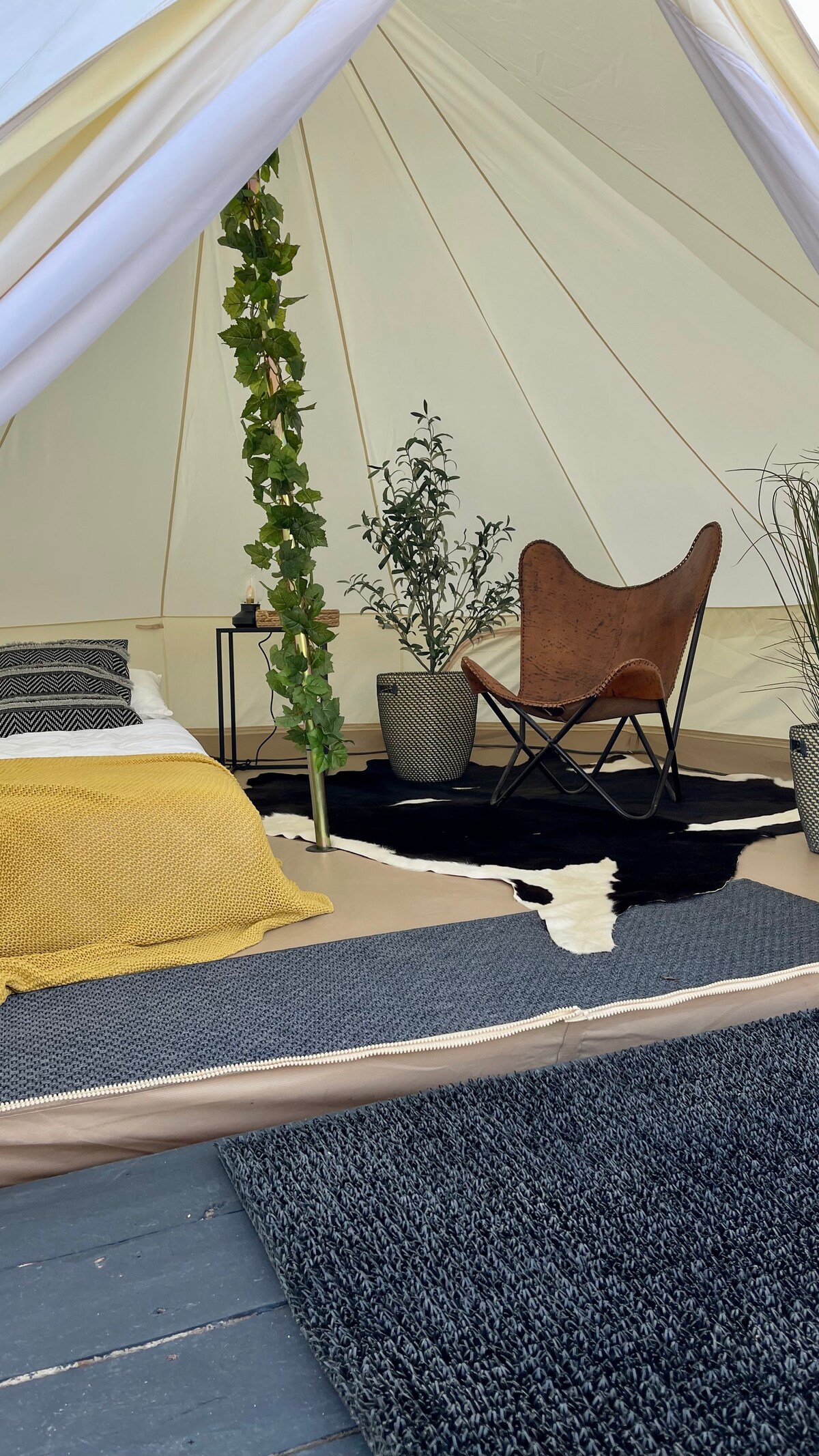 Hear the waves crash in this stylish glamping bell tent, only minutes walking from the beach, centrally located between the 2 best surf breaks. Memory-foam queen (+foldout twin), fridge w/ bar tools, camping essentials & wifi on fenced & landscaped property w/private bathroom, out & indoor showers, fire pit & landscaped lounging area w/hammock & chairs. Bbq grill & outdoor counter w/sink, microwave. Located on a peaceful and safe cul-de-sac with restaurant and day spa a stones throw away.