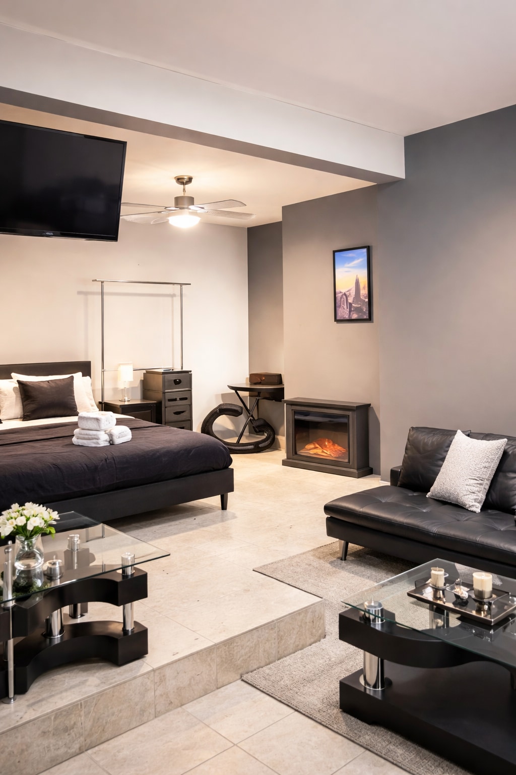 Driftwood Suite · Romantic Seaview Terrace Wake with the sun and wander to the beach. Spend your days swimming, snorkeling, and exploring the coast, then return salty and sun-warmed to soak in the shared hot tub beneath Baja’s star-filled sky. This charming 460-sq-ft loft-style suite features a king bed, kitchenette, bistro/work bar, private bath, A/C, Wi-Fi, TV, and a romantic terrace perfect for sunset dinners. Five minutes to the beach. Shared infinity pool, hot tub, fire pit, and grill.